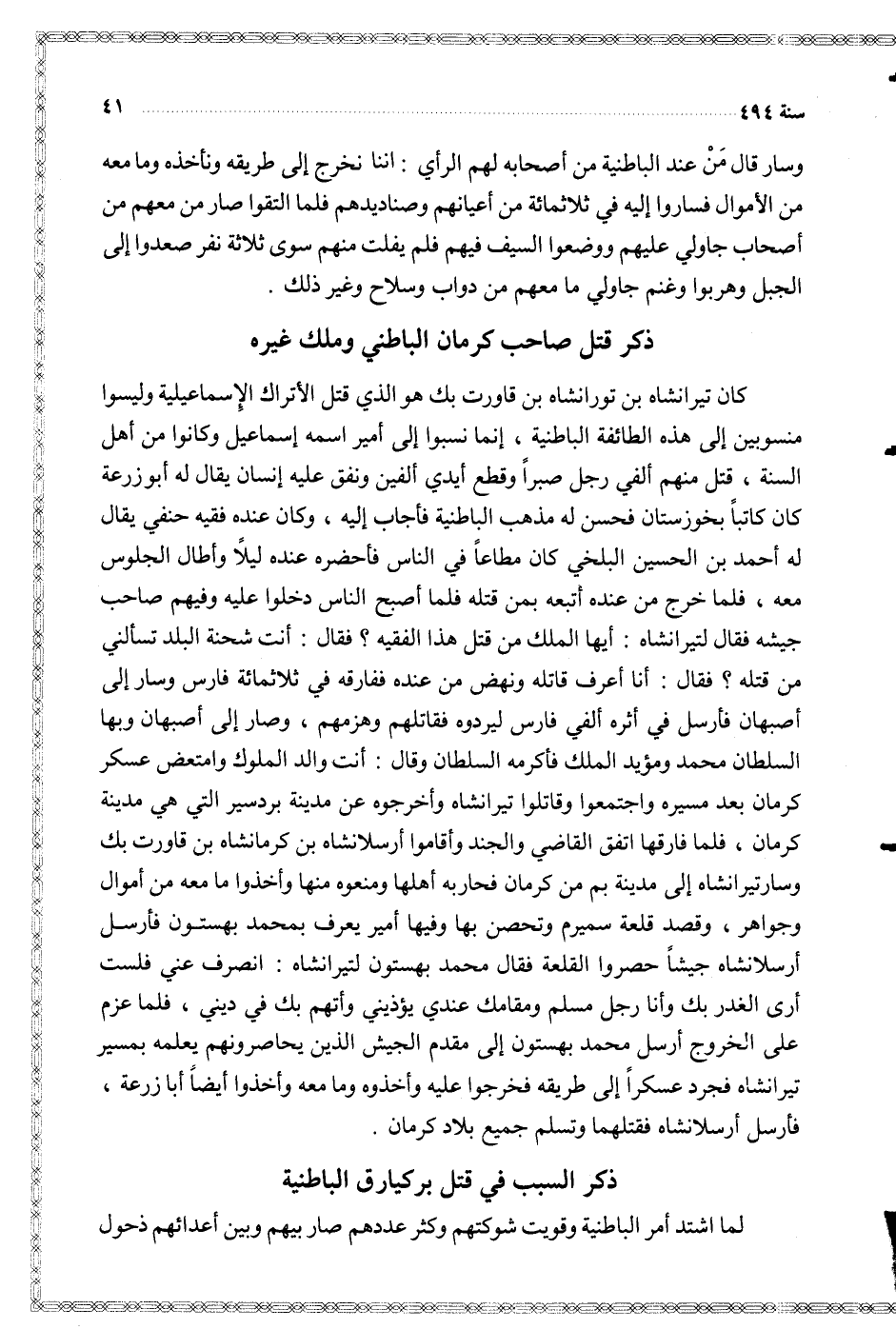 كان تيرانشاه بن قاروت بك هو الذي قتل الأتراك الإسماعيلية وليسوا منسوبين إلى هذه الطائفة الباطنية إنما نسبوا إلى أمير اسمه إسماعيل وكانوا من أهل السنة قتل منهم الفي رجل صبرا وقطع أيدي ألفين ونفق عليه إنسان يقال له أبو زرعة كان كاتبا بخوزستان فحسن له مذهب الباطنية فأجاب إليه وكان عنده فقيه حنفي يقال له أحمد بن الحسين البلخي كان مطاعا في الناس فأحضره عنده ليلا وأطال الجلوس معه فلما خرج من عنده أتبعه بمن قتله فلما أصبح الناس دخلوا عليه وفيهم صاحب جيشه فقال لتيرانشاه أيها الملك من قتل هذا الفقيه أيها الملك من قتل هذا الفقيه فقال أنت شحنة البلد تسألني من قتله فقال أنا أعرف قاتله ونهض من عنده ففارقه في ثلاثمائة فارس وسار إلى أصبهان فأرسل في أثره ألفي فارس ليردوه فقاتلهم وهزمهم وصار إلى أصبهان وبها السلطان محمد ومؤيد الملك فأكرمه السلطان وقال أنت والد الملوك وامتعض عسكر كرمان بعد مسيره واجتمعوا وقاتلوا تيرانشاه وأخرجوه عن مدينة بردسير التي هي مدينة كرمان فلما فارقها اتفق القاضي والجند وأقاموا أرسلانشاه بن كرمانشاه بن قاروت بك وسارتيرانشاه إلى مدينة بم من كرمان فحاربه أهلها ومنعوه منها وأخذوا ما معه من أموال وجواهر وقصد قلعة سميرم وتحصن بها وفيها أمير يعرف بمحمد بهستون فأرسل أرسلانشاه جيشا حصروا القلعة فقال محمد بهستون لتيرانشاه انصرف عني فلست أرى الغدر بك وأنا رجل مسلم ومقامك عندي يؤذيني وأتهم بك في ديني فلما عزم على الخروج أرسل محمد بهستون إلى مقدم الجيش الذين يحاصرونهم يعلمه بمسير تيرانشاه فجرد عسكرا إلى طريقه فخرجوا عليه وأخذوه وما معه وأخذوا أيضا أبا زرعة فأرسل أرسلانشاه فقتلهما وتسلم جميع بلاد كرمان