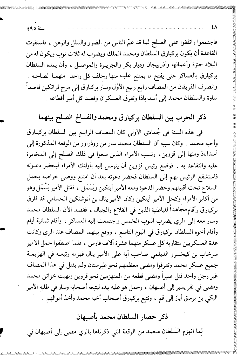 فوضع رئيس قزوين أن يتوسل إليه بأولئك الأمراء ليحضر دعوته فاستشفع بهم إلى السلطان فحضر دعوته بعد أن امتنع ووصى خواصه بحمل السلاح تحت أقبيتهم وحضر الدعوة ومعه الأمير أيتكين وبسمل فقتل الأمير بسمل وهو من أكابر الأمراء وكحل الأمير أيتكين وكان الأمير ينال بن أنوشتكين الحسامي قد فارق بركياق وأقام مجاهدا للباطنية الذين في القلاع والجبال فقصد الآن السلطان محمد وسار معه إلى الري يضرب النوب الخمس واجتمعت إليه العساكر وأقام ثمانية أيام وأقام أخوه السلطان بركيارق في اليوم التاسع ووقع بينهما المصاف عند الري وكانت عدة العسكريين متقاربة كل عسكر منهما عشرة آلاف فارس فلما اصطفوا حمل الأمير سرخاب بن كيخسرو الديلمي صاحب آبة على الأمير ينال فهزمه وتبعه في الهزيمة جميع عسكر محمد وتفرقوا ومضى معظمهم نحو طبرستان ولم يقتل في هذا المصاف غير رجل واحد قتل صبرا ومضى قطعة من المنهزمين نحو قزوين ونهبت خزائن محمد ومضى في نفر يسير إلى أصبهان وحمل هو عليه بيده ليتبعه أصحابه وسار في طلبه الأمير البكي بن برسق أياز إلى قم وتتبع بركيارق أصحاب أخيه محمد وأخذ أموالهم