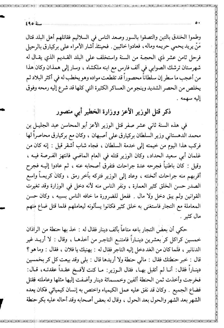في هذه السنة ثاني عشر صفر الوزير الأعز أبو المحاسن عبد الجليل بن محمد الدهستاني وزير السلطان بركيارق على أصبهان وكان مع بركيارق محاصرا لها فركب هذا اليوم من خيمته إلى خدمة السلطان فجاء شاب أشقر قيل إنه كان من غلمان أبي سعيد الحداد وكان الوزير قتله في العام الماضي فانتهز الفرصة فيه وقيل كان باطنيا فجرحه عدة جراحات فتفرق أصحابه عنه ثم عادوا إليه فجرح أقربهم منه جراحات أثخنته وعاد إلى الوزير فتركه بآخر رمق وكان كريما واسع الصدر حسن الخلق كثير العمارة ونفر الناس منه لأنه دخل في الوزارة وقد تغيرت القوانين ولم يبق دخل ولا مال
