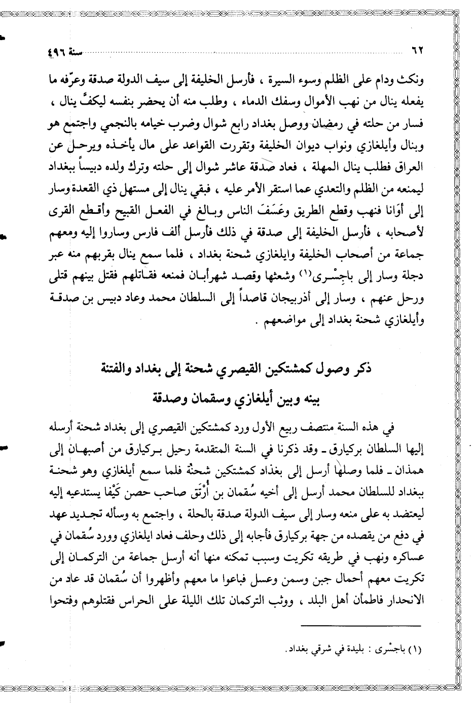 $ ذكر وصول كمشتكين القيصري شحنة إلى بغداد والفتنة بينه وبين أيلغازي وسقمان وصدقة $