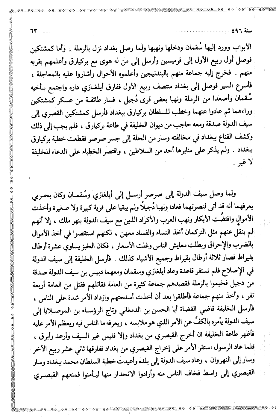 فخرج إليه جماعة منهم بالبندنيجين وأعلموه الأحوال واشاروا عليه بالمعاجلة فأسرع السير فوصل إلى بغداد منتصف ربيع الأول ففارق أيلغازي داره واجتمع بأخيه سقمان وأصعد من الرملة ونهبا بعض قرى دجيل فسار طائفة من عسكر كمشتكين وراءهما ثم عادوا عنهما وخطب للسلطان بركيارق ببغداد كمشتكين القصري إلى سيف الدولة القناع ببغداد في مخالفته وسار من الحلة إلى جسر صرصر فقطعت خطبة بركيارق ببغداد