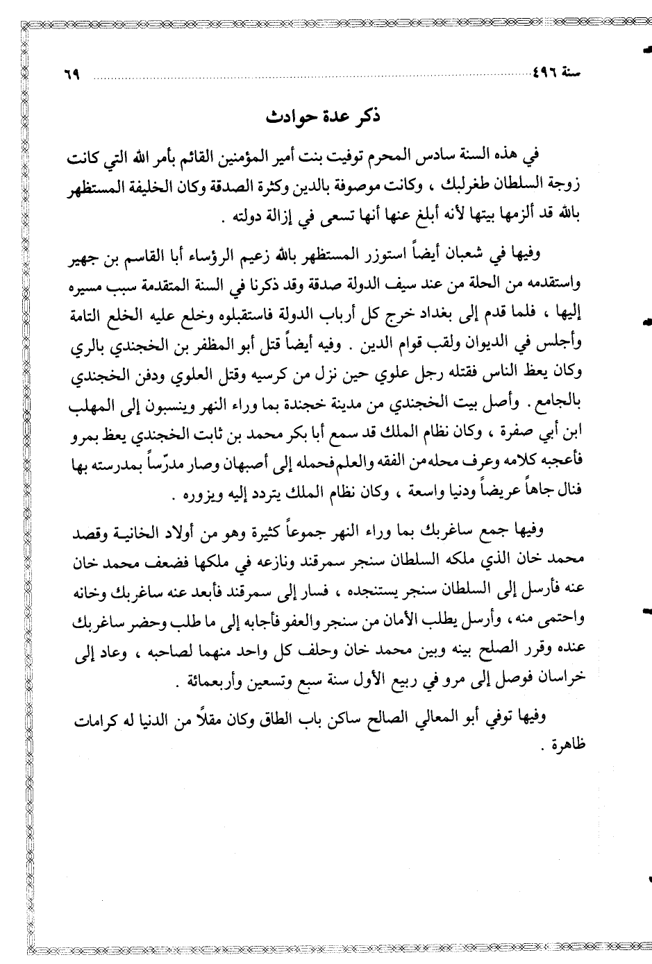 وفيها جمع ساغربك بما وراء النهر جموعا كثيرة وهو من أولاد الخانية وقصد محمد خان الذي ملكه السلطان سنجر سمرقند ونازعه في ملكها فضعف محمد خان عنه فأرسل إلى السلطان سنجر يستنجده فسار إلى سمرقند فأبعد عنه ساغربك وخانه واحتمى منه وأرسل يطلب الأمان من سنجر والعفو فأجابه إلى ما طلب وحضر ساغربك وقرر الصلح بينه وبين محمد خان وحلف كل منهما لصاحبه وعاد إلى خراسان فوصل إلى مرو في ربيع الأول سنة سبع وتسعين وأربعمائة