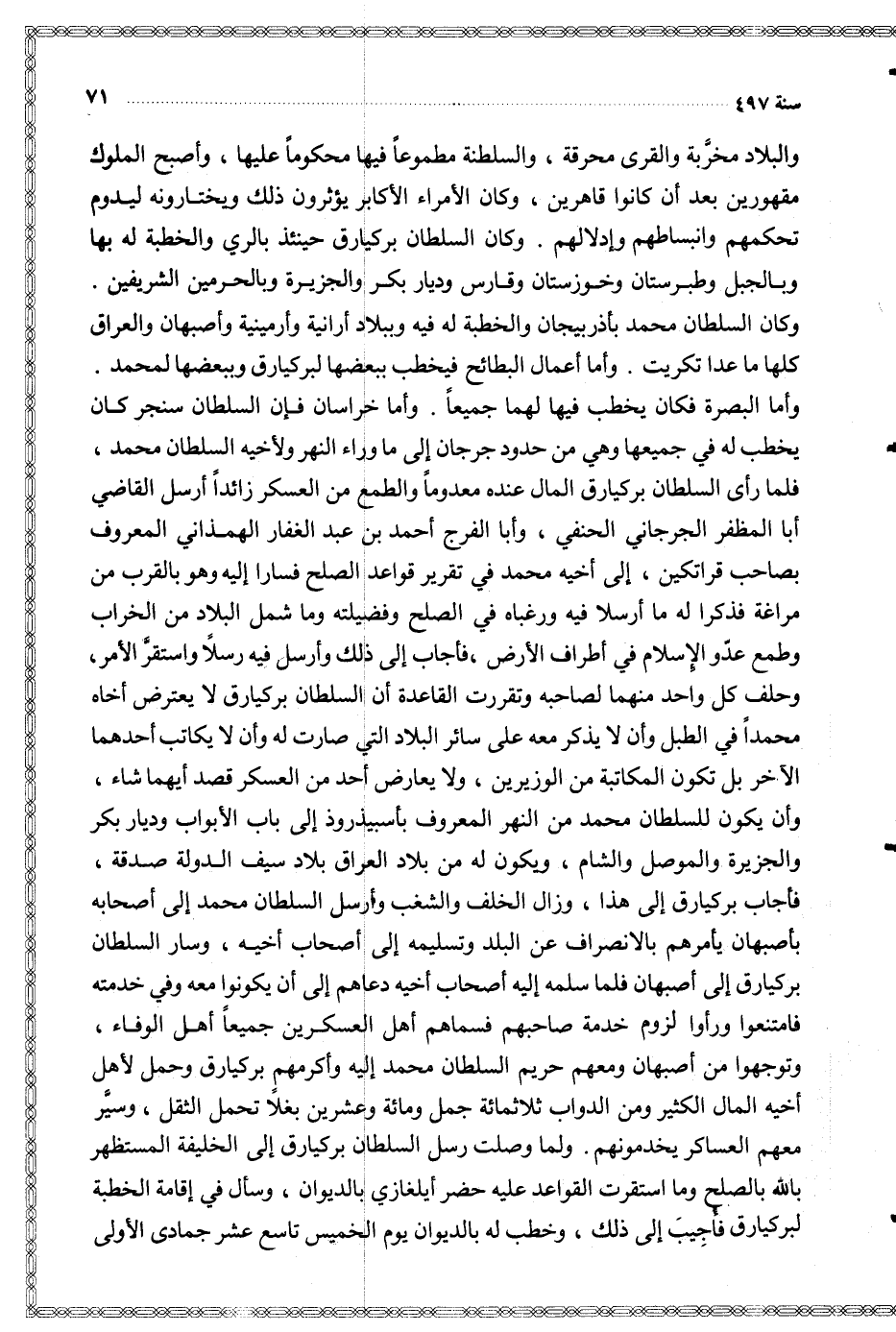 وأما خراسان فإن السلطان سنجر كان يخطب له في جميعها وهي من حدود جرجان إلى ما وراء النهر ولأخيه السلطان محمد فلما رأى السلطان بركيارق المال عنده معدوما والطمع من العسكر زائدا أرسل القاضي أبا المظفر الجرجاني الحنفي وأبا الفرج بن عبد الغفار الهمذاني المعروف بصاحب قراتكين إلى أخيه محمد في تقرير قواعد الصلح فسار إليه وهو بالقرب من مراغة فذكرا له ما أرسلا فيه ورغباه في الصلح وفضيلته وما شمل البلاد من الخراب وطمع عدو الإسلام في أطراف الأرض فأجاب إلى ذلك وأرسل فيه رسلا واستقر الأمر وحلف كل واحد منهما لصاحبه وتقررت القاعدة أن السلطان بركيارق لا يعترض أخاه محمدا في الطبل وأن لا يذكر معه على سائر البلاد التي صارت له وأن لا يكاتب أحدهما الآخر بل تكون المكاتبة من الوزيرين ولا يعارض أحد من العسكر قصد أيهما شاء وأن يكون للسلطان محمد من النهر المعروف بأسبيذ إلى باب الأبواب وديار بكر والجزيرة والموصل والشام ويكون له من بلاد العراق بلاد سيف الدولة صدقة فأجاب بركيارق إلى هذا وزال الخلف والشغب وأرسل السلطان محمد إلى أصحابه بأصبهان يأمرهم بالانصراف عنالبلد وتسليمه إلى أصحاب أخيه وسار السلطان بركيارق إلى أصبهان فلما سلمه إليه أصحاب أخيه وسار السلطان بركيارق إلى أصبهان فلما سلمه إليه أصحاب أخيه دعاهم إلى أن يكونوا معه وفي خدمته فامتنعوا ورأوا لزوم خدمة صاحبهم فسماهم أهل العسكرين جميعا أهل الوفاء وتوجهوا من أصبهان ومعهم حريم السلطان محمد إليه وأكرمهم بركيارق وحمل لأهل أخيه المال الكثير ومن الدواب ثلاثمائة جمل ومائة وعشرين بغلا تحمل الثقل وسير معهم العساكر ويخدمونهم