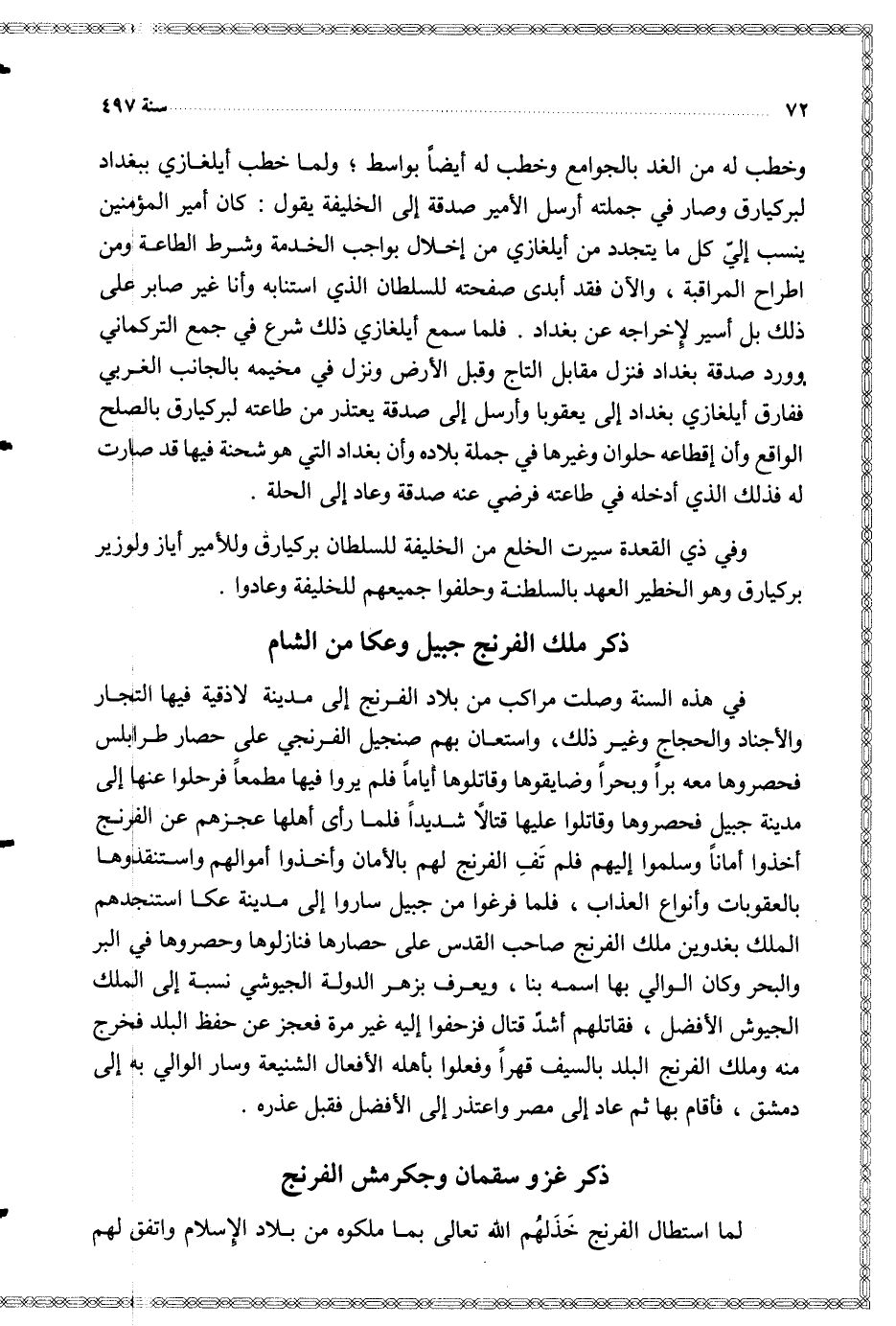 في ذهه السنة وصلت مراكب من بلاد الفرنج إلى مدينة لاذقية فيها التجار والأجناد والحجاج وغير ذلك واستعان بهم صنجيل الفرنجي على حصار طرابلس فحصروها معه برا وبحرا وضايقوها وقاتلوها إماما فلم يروا فيها مطمعا فرحلوا عنها إلى مدينة جبيل فحصروها وقاتلوا عليها قتالا شديدا فلما رأى أهلها عجزهم عن الفرنج أخذوا أمانا وسلموا إليهم فلم تف الفرنج لهم بالأمان وأخذوا أموالهم واستنفذوها بالعقوبات وأنواع العذاب فلما فرغوا من جبيل ساروا إلى مدينة عكا استنجدهم الملك بغدوين ملك الفرنج صاحب القدس على حصارها فنازلوها وحصروها في البر والبحر وكان الوالي بها اسمه بنا ويعرف بزهر الدولة الجيوشي نسبة إلى الملك الجيوش الأفضل فقاتلهم أشد قتال فزحفوا إليه غير مرة فعجز عن حفظ البلد فخرج منه وملك الفرنج البلد بالسيف قهرا بأهله الأفعال الشنيعة وسار الوالي به إلى دمشق فأقام بها ثم عاد إلى مصر واعتذر إلى الأفضل فقبل عذره
