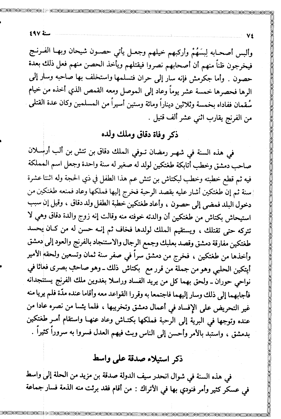 في هذه السنة في شهر رمضان توفي الملك دقاق بن تتش بن ألب أرسلان صاحب دمشق وخطب أتابكة طغتكين لولد له صغير له سنة واحدة وجعل اسم المملكة فيه ثم قطع خطبته وخطب لبكتاش بن تتش عم هذا الطفل في ذي الحجة وله اثنتا عشرة سنة ثم إن طغتكين أشار عليه بقصد الرحبة فخرج إليها فملكها وعاد فمنعه طغتكين وقيل إن سبب أستيحاش بكتاش من طغتكين أن والدته خوفته منه وقالت إنه زوج والدة دقاق وهي لا تتركه حتى تقتلك ويستقيم الملك لولدها فخاف ثم إنه حسن له من كان يحسد طغتكين مفارقة دمشق وقصد بعلبك وجمع الرجال والاستنجاد بالفرنج والعود إلى دمشق وأخذها من طغتكين فخرج من دمشق سرا في صفر سنة ثمان وتسعين ولحقه الأمير أيتكين الحلبي وهو منجملة من قرر مع بكتاش ذلك وهو صاحب بصرى فعاثا في نواحي حوران ولحق بهما كل من يريد الفساد وراسلا بغدوين ملك الفرنج يستنجدانه فأجابهما إلى ذلك وسار إليهمات فاجتمعا به وقررا القواعد معه وأقاما عنده مدة فلم يريا منه غير التحريض على الإفساد في أعمال دمشق وتخريبها فلما يئسا من نصره عادا من عنده وتوجها في البرية إلى الرحبة فملكها بكتاش وعاد عنها واستقام أمر طغتكين بدمشق واستبد بالأمر وأحسن إلى الناس وبث فيهم العدل فسروا به سرورا كثيرا