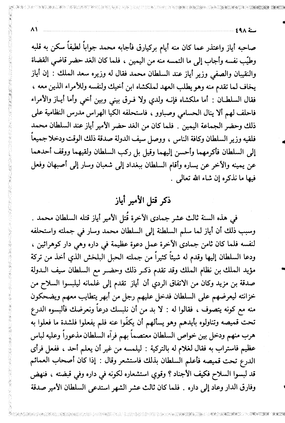 فلما كان من الغد حضر الأمير أياز عند السلطان محمد فلقيه وزير السلطان وكافة الناس ووصل سيف الدولة صدقة ذلك الوقت ودخلا جميعا إلى السلطان فأكرمهما وأحسن إليهما وقيل بل ركب السلطان ولقيهما ووقف أحدهما عن يمينه والآخر عن يساره وأقام السلطان ببغداد إلى شعبان وسار إلى أصبهان وفعل فيها ما نذكره إن شاء الله تعالى