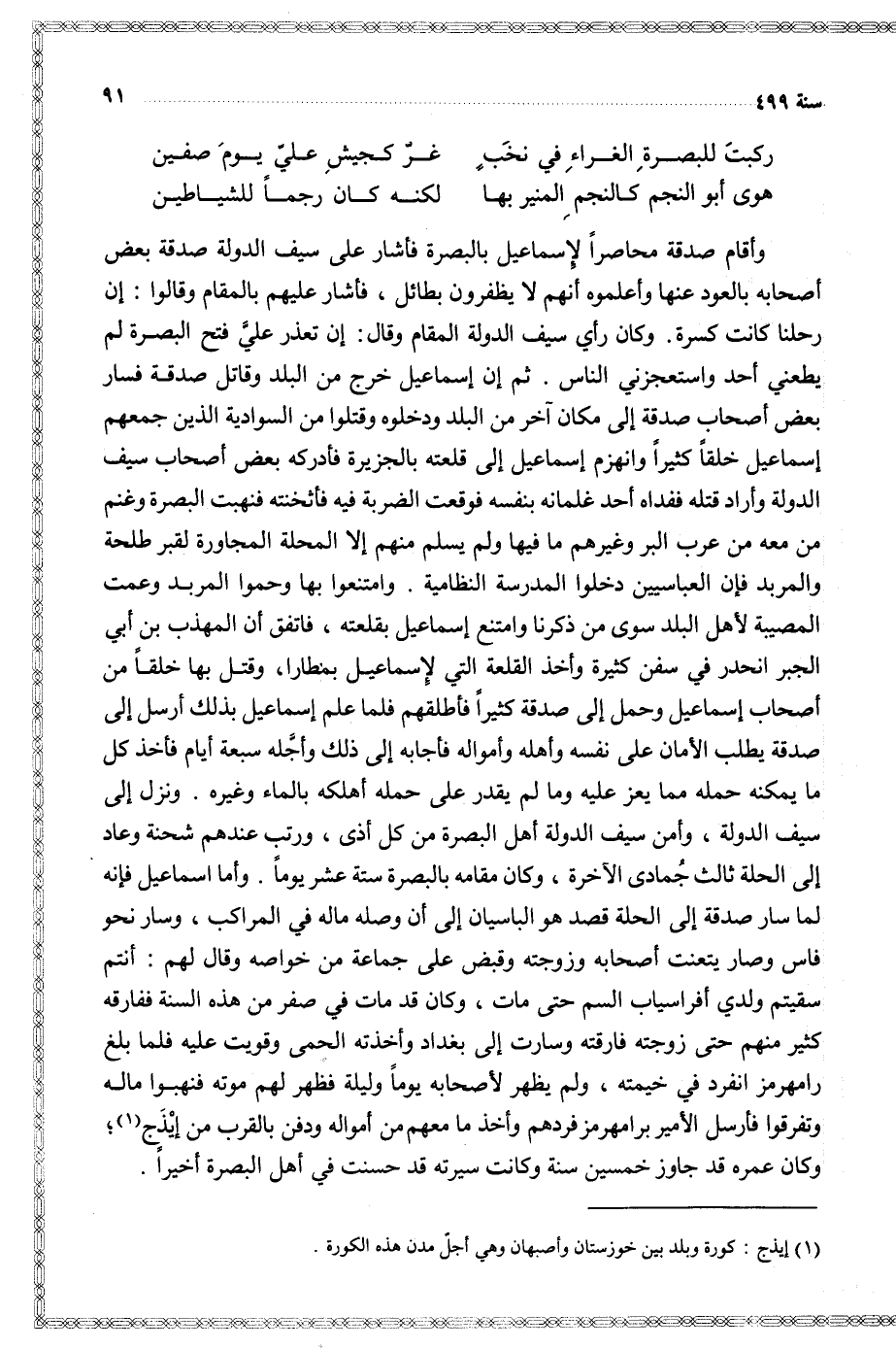ونزل إلى سيف الدولة وأمن سيف الدولة أهل البصرة من كل أذى ورتب عندهم شحنة وعاد إلى الحلة ثالث جمادى الآخرة وكان مقامه بالبصرة سنة عشر يوما