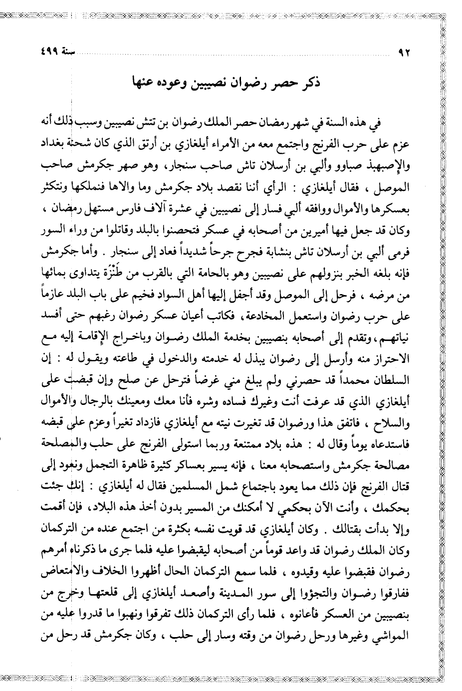 في هذه السنة في شهر رمضان حصر الملك رضوان بن تتش نصيبين وسبب ذلك أنه عزم على حرب الفرنج واجتمع معه الأمراء أيلغازي بن أرتق الذي كان شحنة بغداد والإصبهبذ صباوو وألبي بن أرسلان تاش صاحب سنجار وهو صهر جكرمش صاحب الموصل فقال أيلغازي الرأي أننا نقصد بلاد جكرمش وما والاها فنملكها ونتكثر بعسكرها والأموال ووافقه ألبي فسار نصيبين ف عشرة آلاف فارس مستهل رمضان وكان قد جعل فيها أميرين من أصحابه في عسكر فتحصنوا بالبلد وقاتلوا من وراء السور فرمى ألبي بن أرسلان تاش بنشابة فجرح جرحا شديدا فعاد إلى سنجار
