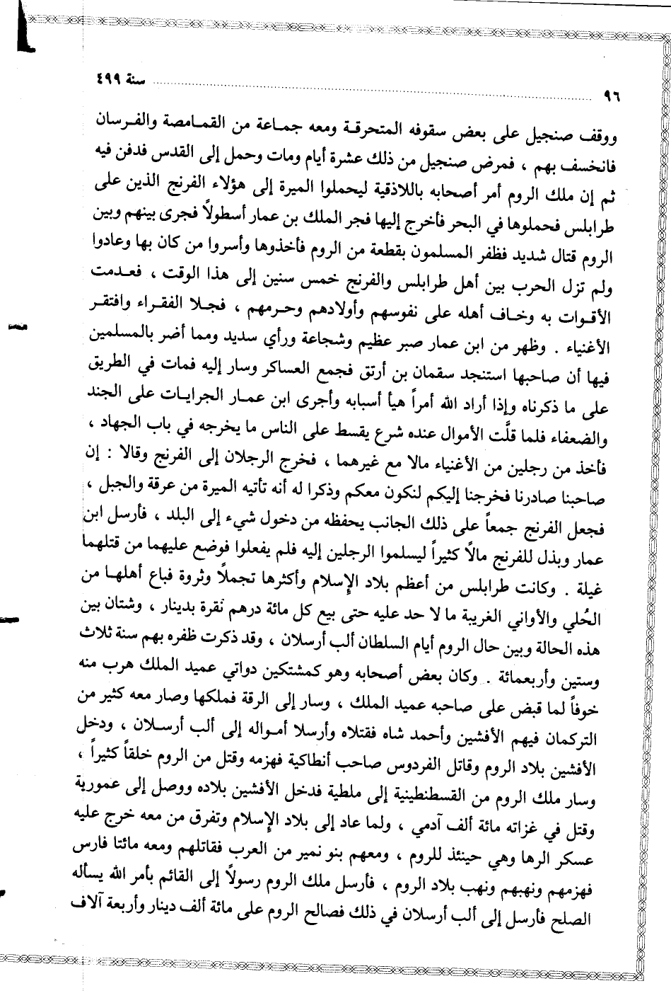 وكانت طرابلس من أعظم بلاد الإسلام وأكثرها تجملا وثروة فباع أهلها من الحلي والأواني الغربية ما لا حد عليه حتى بيع كل مائة درهم نقرة بدينار وشتان بين هذه الحالة وبين حال الروم أيام السلطان ألب أرسلان وقد ذكرت ظفره بهم سنة ثلاث وستين وأربعمائة
