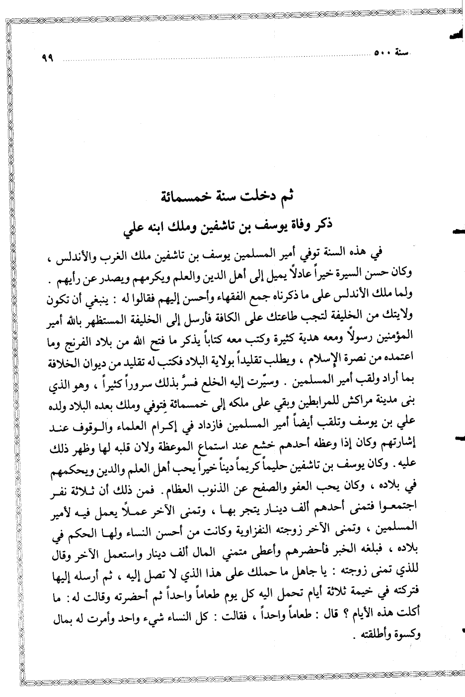 في هذه السنة توفي أمير المسلمين يوسف بن تاشفين ملك الغرب والأندلس وكان حسن السيرة خيرا عادلا يميل إلى أهل الدين والعلم ويكرمهم ويصدر عن رأيهم