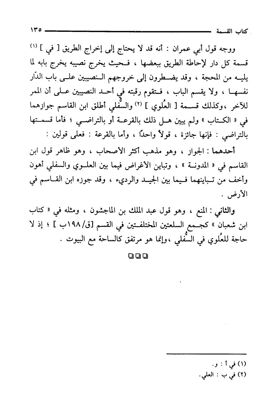 ووجه قول أبي عمران: أنه قد لا يحتاج إلى إخراج الطريق [في] (¬1) قسمة كل دار لإحاطة الطريق ببعضها، فحيث يخرج نصيبه يخرج بابه لما يليه من المحجة، وقد يضطرون إلى خروجهم النصيبين علي باب الدّار نفسها, ولا يقسم الباب، فتقوم رقبته في أحد النصيبين على أن الممر للآخر، وكذلك قسمة [العُلوي] (¬2) والسُّفلي أطلق ابن القاسم جوازهما في "الكتاب" ولم يبين هل ذلك بالقرعة أو بالتراضي؛ فأما قسمتها بالتراضي: فإنها جائزة، قولًا واحدًا، وأما بالقرعة: فعلى قولين: