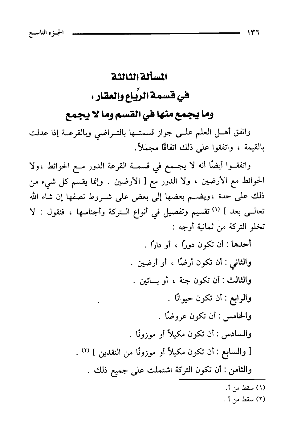 المسألة الثالثة في قسمة الرِّياع والعقار، وما يجمع منها في القسم وما لا يجمع