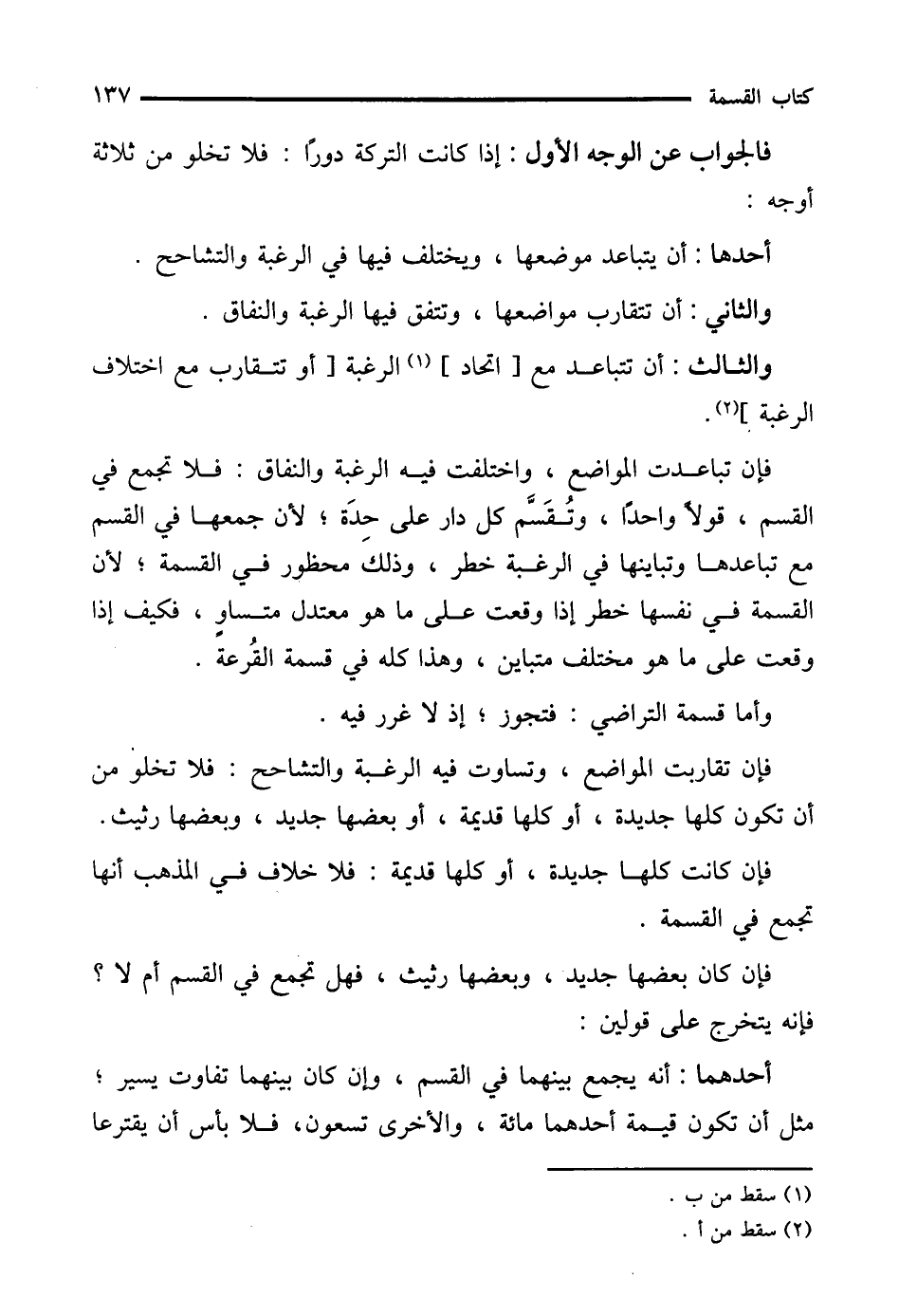 فإن تقاربت المواضع، وتساوت فيه الرغبة والتشاحح: فلا تخلو من أن تكون كلها جديدة، أو كلها قديمة، أو بعضها جديد، وبعضها رثيث.