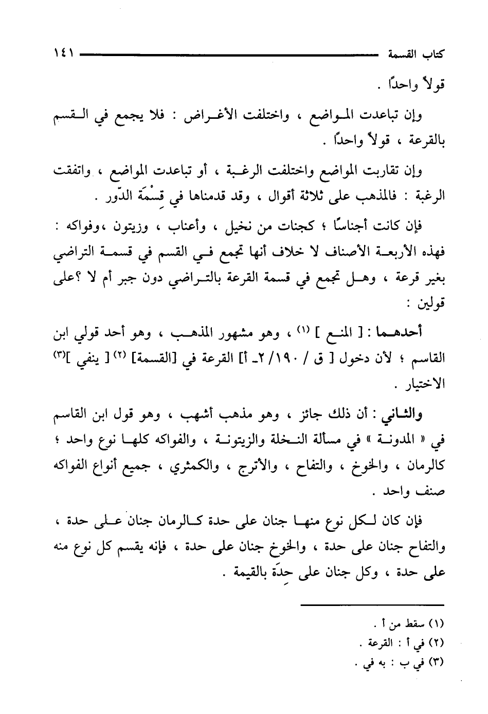 فإن كانت أجناسًا؛ كجنات من نخيل، وأعناب، وزيتون، وفواكه: فهذه الأربعة الأصناف لا خلاف أنها تجمع في القسم في قسمة التراضي بغير قرعة، وهل تجمع في قسمة القرعة بالتراضي دون جبر أم لا؟ على قولين: