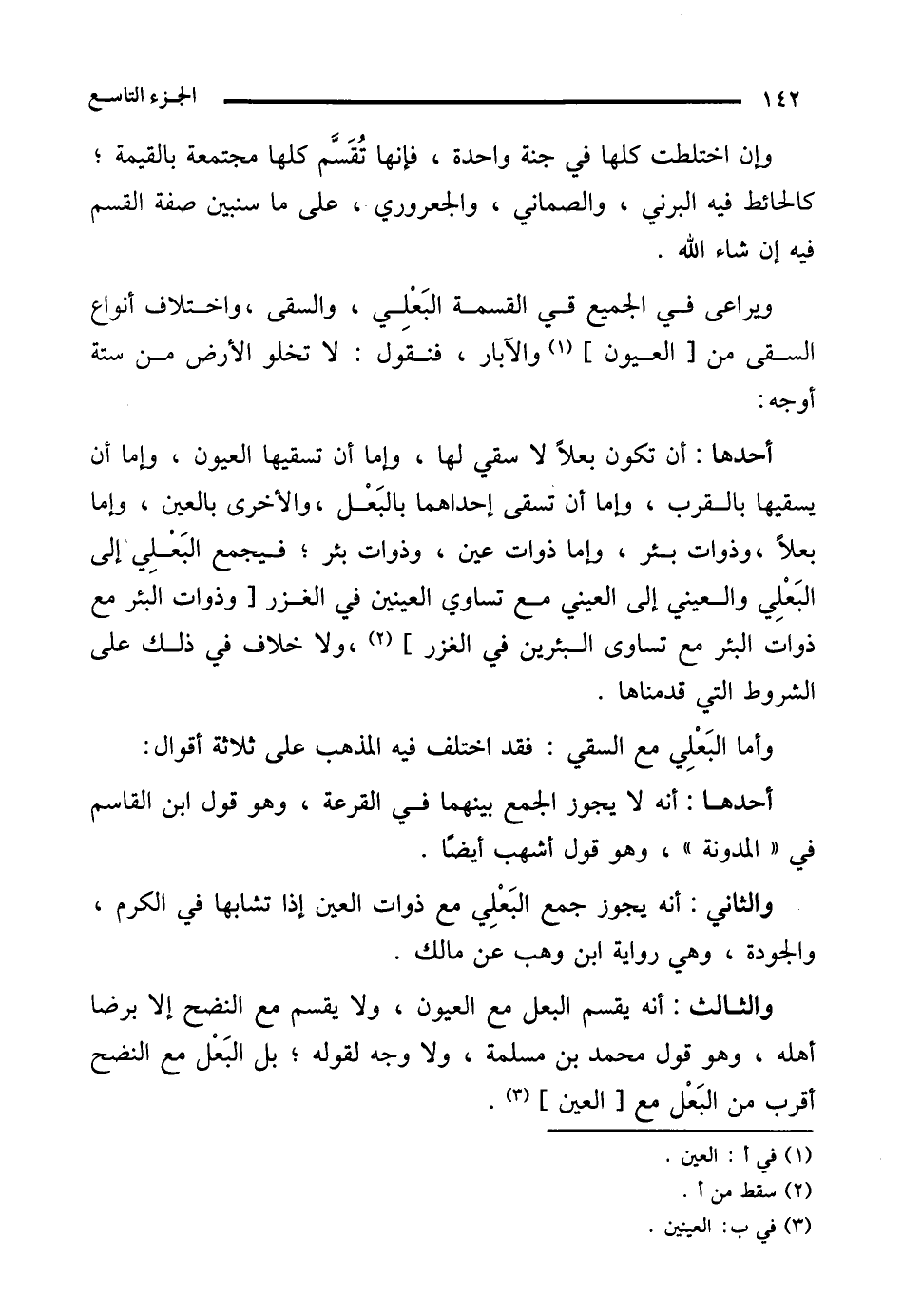 والثالث: أنه يقسم البعل مع العيون، ولا يقسم مع النضح إلا برضا أهله، وهو قول محمَّد بن مسلمة، ولا وجه لقوله؛ بل البَعْل مع النضح أقرب من البَعْل مع [العين] (¬3).