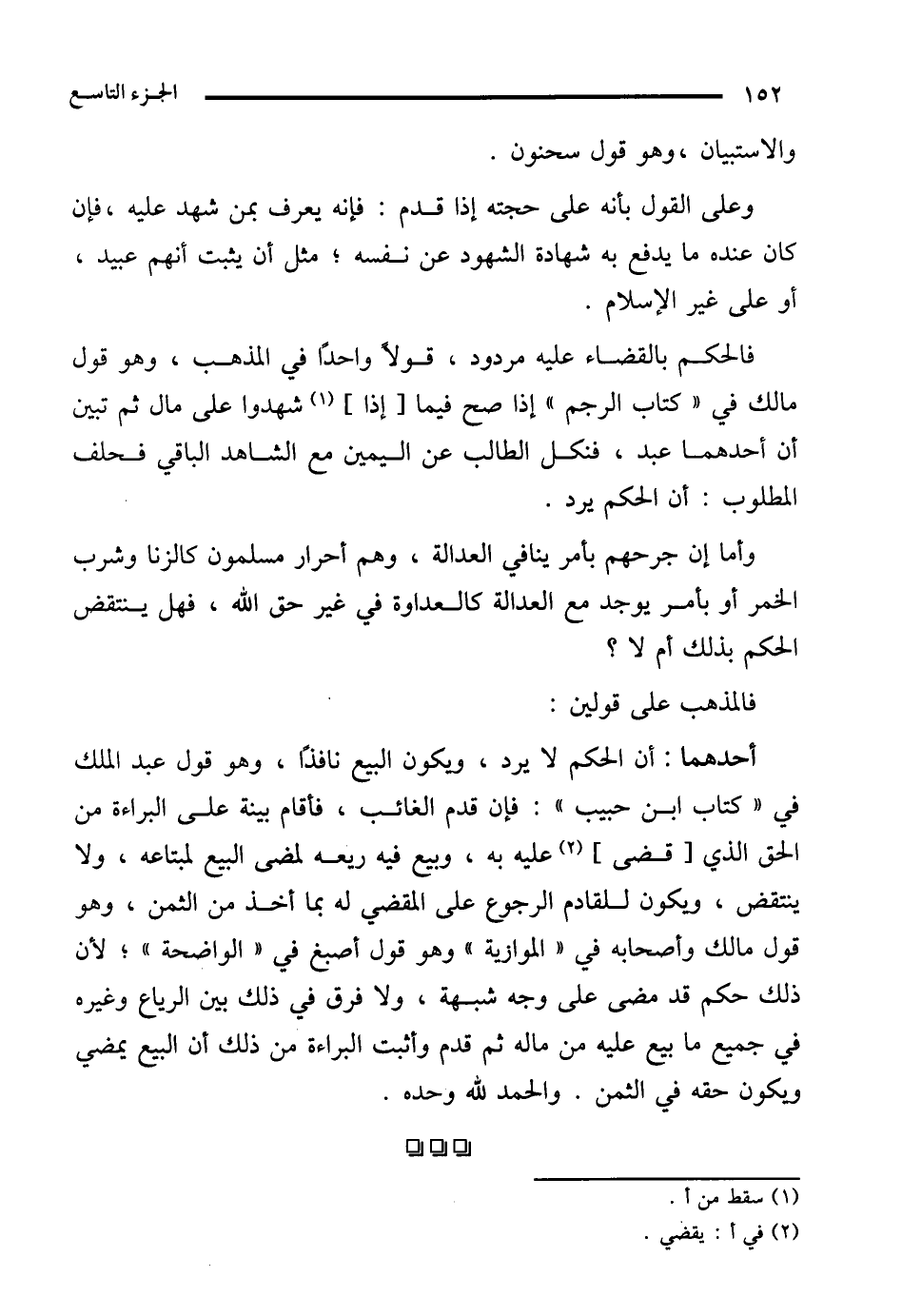 أحدهما: أن الحكم لا يرد، ويكون البيع نافذًا، وهو قول عبد الملك في "كتاب ابن حبيب": فإن قدم الغائب، فأقام بينة على البراءة من الحق الذي [قضى] (¬2) عليه به، وبيع فيه ريعه لمضى البيع لمبتاعه، ولا ينتقض، ويكون للقادم الرجوع على المقضي له بما أخذ من الثمن، وهو قول مالك وأصحابه في "الموازية" وهو قول أصبغ في "الواضحة"؛ لأن ذلك حكم قد مضى على وجه شبهة، ولا فرق في ذلك بين الرياع وغيره في جميع ما بيع عليه من ماله ثم قدم وأثبت البراءة من ذلك أن البيع يمضي ويكون حقه في الثمن. والحمد لله وحده.
