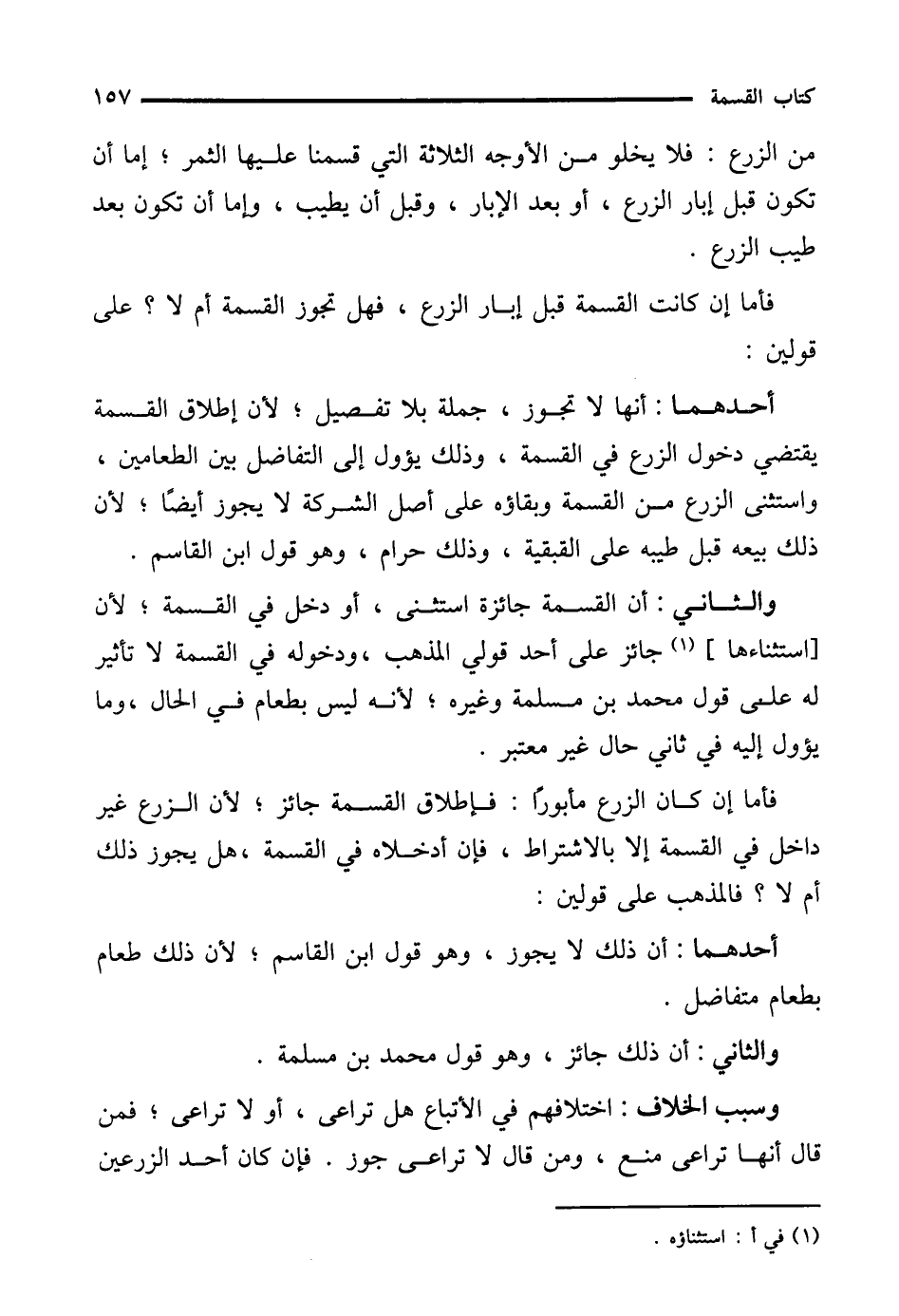 أحدهما: أنها لا تجوز، جملة بلا تفصيل؛ لأن إطلاق القسمة يقتضي دخول الزرع في القسمة، وذلك يؤول إلى التفاضل بين الطعامين، واستثنى الزرع من القسمة وبقاؤه على أصل الشركة لا يجوز أيضًا؛ لأن ذلك بيعه قبل طيبه على البقية، وذلك حرام، وهو قول ابن القاسم.