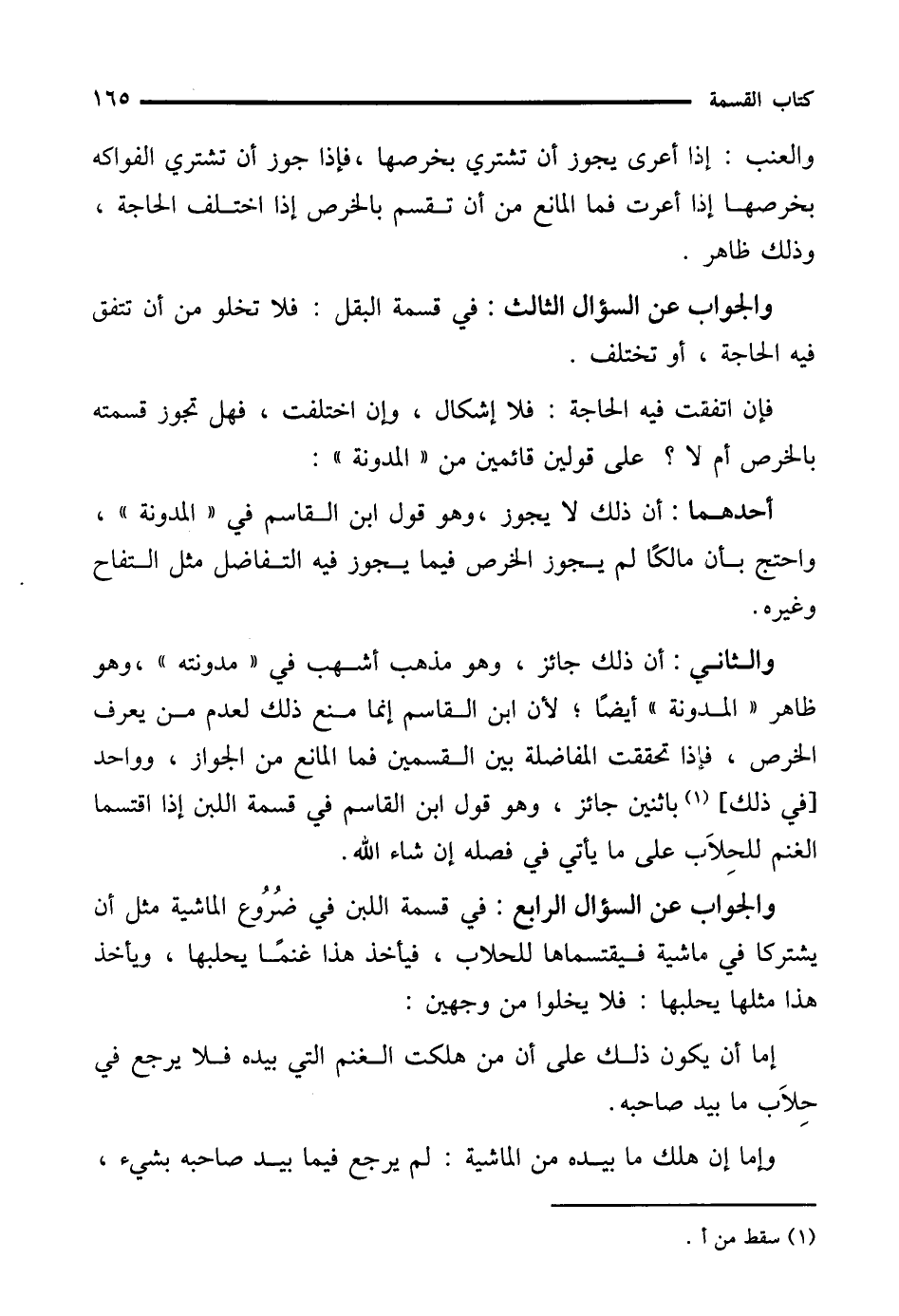 والجواب عن السؤال الرابع: في قسمة اللبن في ضُرُوع الماشية مثل أن يشتركا في ماشية فيقتسماها للحلاب، فيأخذ هذا غنمًا يحلبها، ويأخذ هذا مثلها يحلبها: فلا يخلو من وجهين: