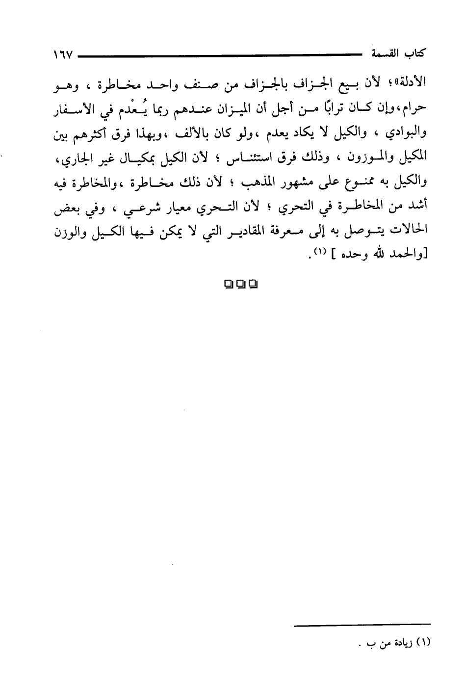الأدلة"؛ لأن بيع الجزاف بالجزاف من صنف واحد مخاطرة، وهو حرام، وإن كان ترابًا من أجل أن الميزان عندهم ربما يُعْدم في الأسفار والبوادي، والكيل لا يكاد يعدم، ولو كان بالألف، وبهذا فرق أكثرهم بين المكيل والموزون، وذلك فرق استئناس؛ لأن الكيل بمكيال غير الجاري، والكيل به ممنوع على مشهور المذهب؛ لأن ذلك مخاطرة، والمخاطرة فيه أشد من المخاطرة في التحري؛ لأن التحري معيار شرعي، وفي بعض الحالات يتوصل به إلى معرفة المقادير التي لا يمكن فيها الكيل والوزن [والحمد لله وحده] (¬1).