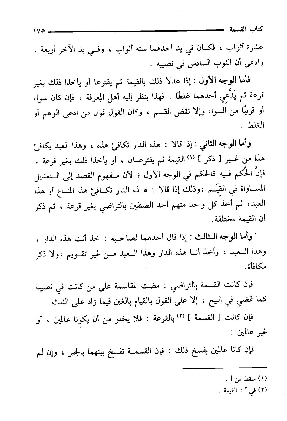 وأما الوجه الثاني: إذا قالا: هذه الدار تكافئ هذه، وهذا العبد يكافئ هذا من غير [ذكر] (¬1) القيمة ثم يقترعان، أو يأخذا ذلك بغير قرعة، فإنَّ الحُكم فيه كالحكم في الوجه الأول؛ لأن مفهوم القصد إلى التعديل المساواة في القِيَم، وذلك إذا قالا: هذه الدار تكافئ هذا المتاع أو هذا العبد، ثم أخذ كل واحد منهم أحد الصنفين بالتراضي بغير قرعة، ثم ذكر أن القيمة مختلفة.