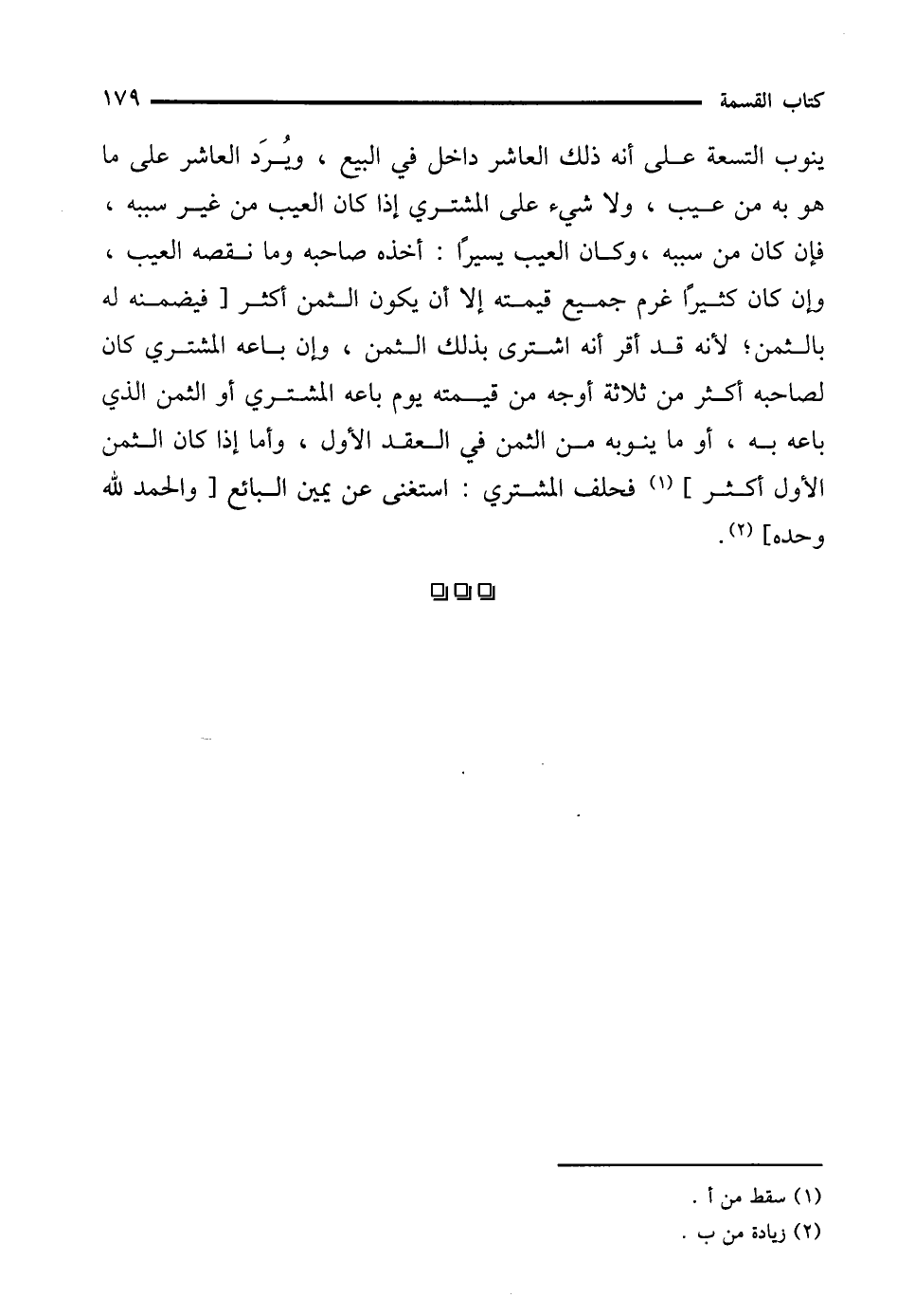 ينوب التسعة على أنه ذلك العاشر داخل في البيع، ويُرَد العاشر على ما هو به من عيب، ولا شيء على المشتري إذا كان العيب من غير سببه، فإن كان من سببه، وكان العيب يسيرًا: أخذه صاحبه وما نقصه العيب، وإن كان كثيرًا غرم جميع قيمته إلا أن يكون الثمن أكثر [فيضمنه له بالثمن؛ لأنه قد أقر أنه اشترى بذلك الثمن، وإن باعه المشتري كان لصاحبه أكثر من ثلاثة أوجه من قيمته يوم باعه المشتري أو الثمن الذي باعه به، أو ما ينوبه من الثمن في العقد الأول، وأما إذا كان الثمن الأول أكثر] (¬1) فحلف المشتري: استغنى عن يمين البائع [والحمد لله وحده] (¬2).
