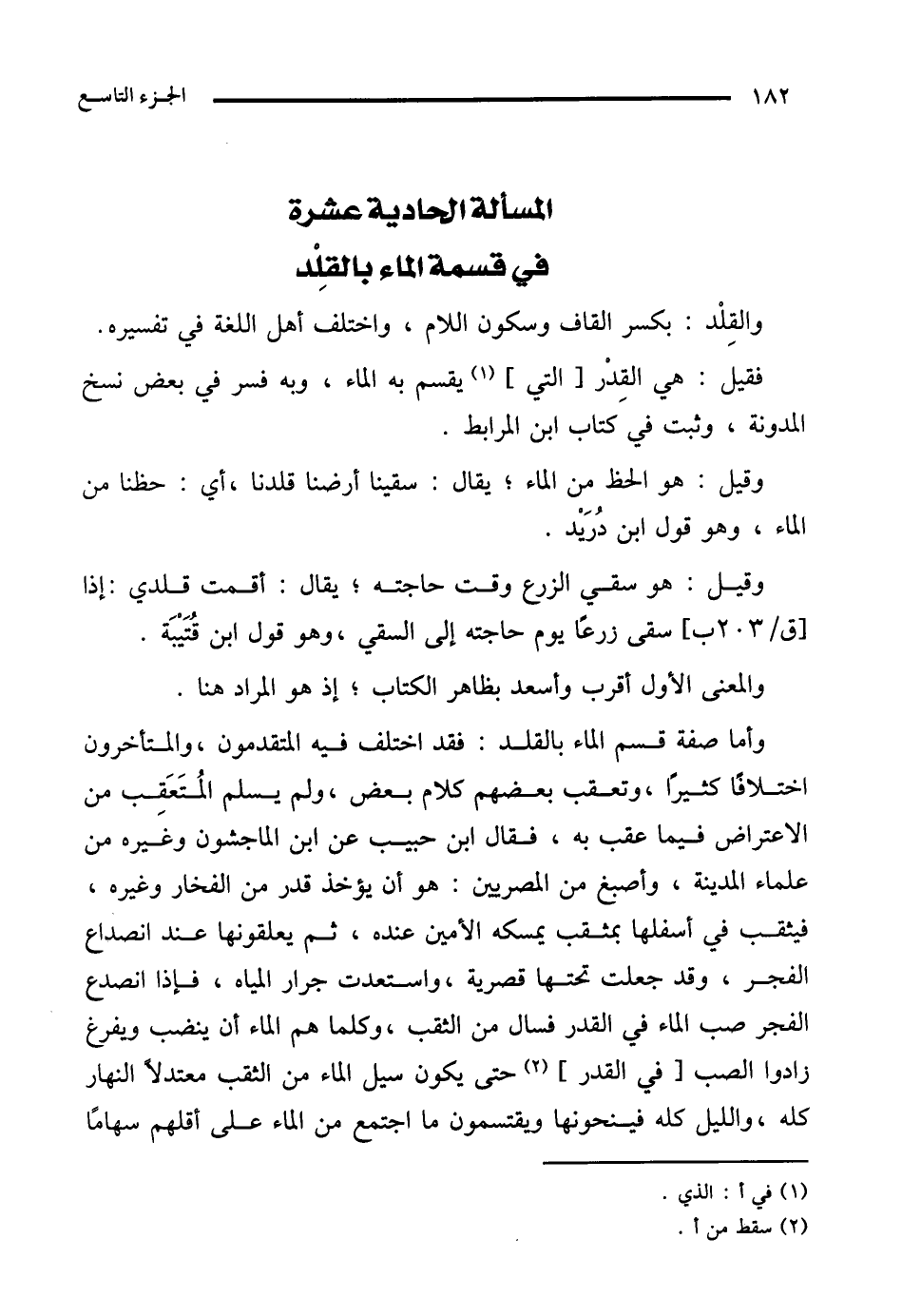 المسألة الحادية عشرة في قسمة الماء بالقِلْد