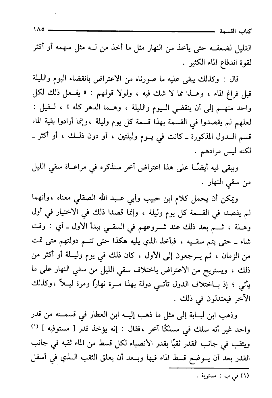قال: وكذلك يبقى عليه ما صورناه من الاعتراض بانقضاء اليوم والليلة قبل فراغ الماء، وهذا مما لا شك فيه، ولولا قولهم: "يفعل ذلك لكل واحد منهم إلى أن ينقضي اليوم والليلة، وهما الدهر كله"، لقيل: لعلهم لم يقصدوا في القسمة بهذا قسمة كل يوم وليلة، وإنما أرادوا بقية الماء قسم الدول المذكورة -كانت في يوم وليلتين، أو دون ذلك، أو أكثر- لكنه ليس مرادهم.
