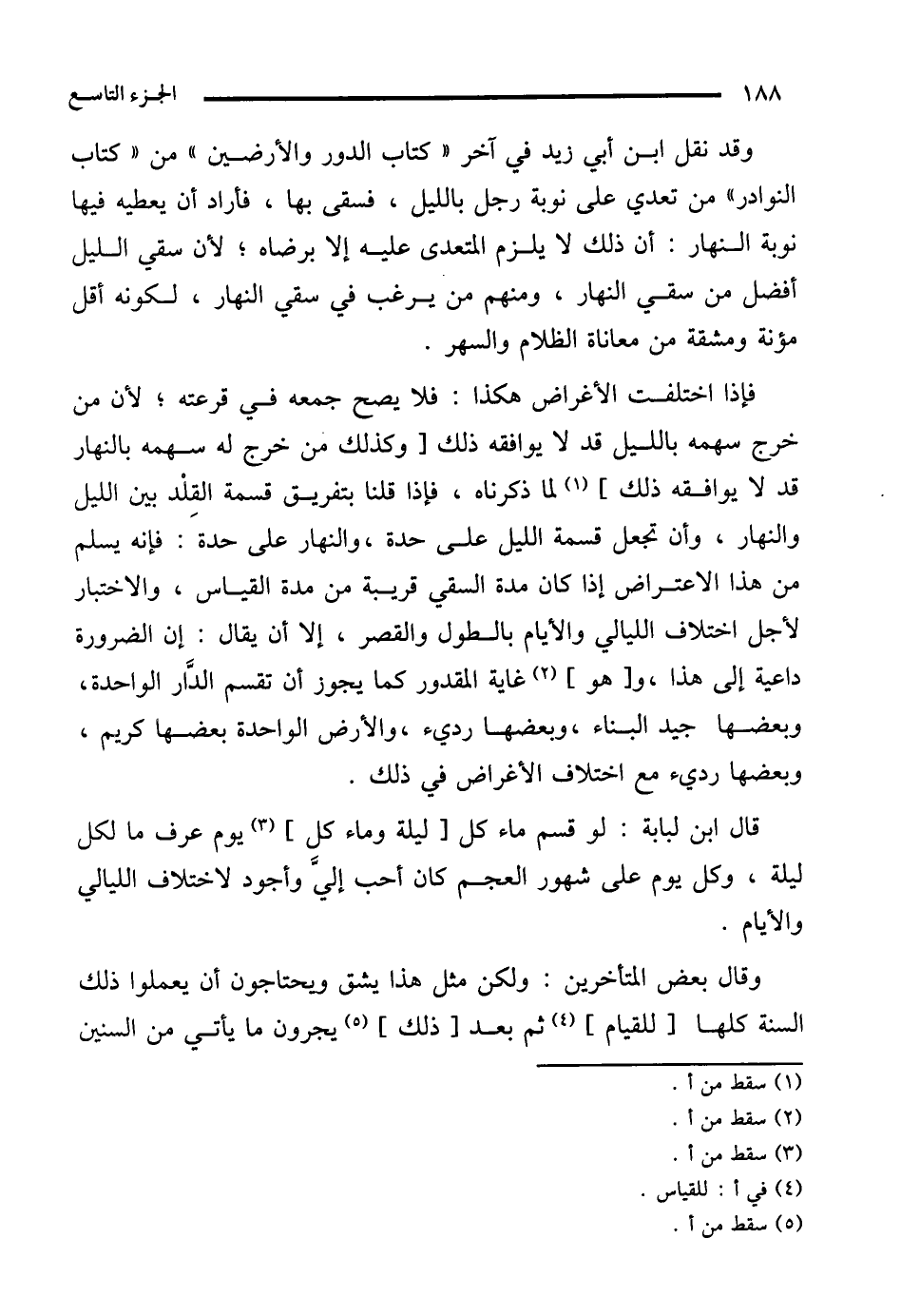 وقد نقل ابن أبي زيد في آخر "كتاب الدور والأرضين" من "كتاب النوادر" من تعدي على نوبة رجل بالليل، فسقى بها، فأراد أن يعطيه فيها نوبة النهار: أن ذلك لا يلزم المتعدى عليه إلا برضاه؛ لأن سقي الليل أفضل من سقي النهار، ومنهم من يرغب في سقي النهار، لكونه أقل مؤنة ومشقة من معاناة الظلام والسهر.