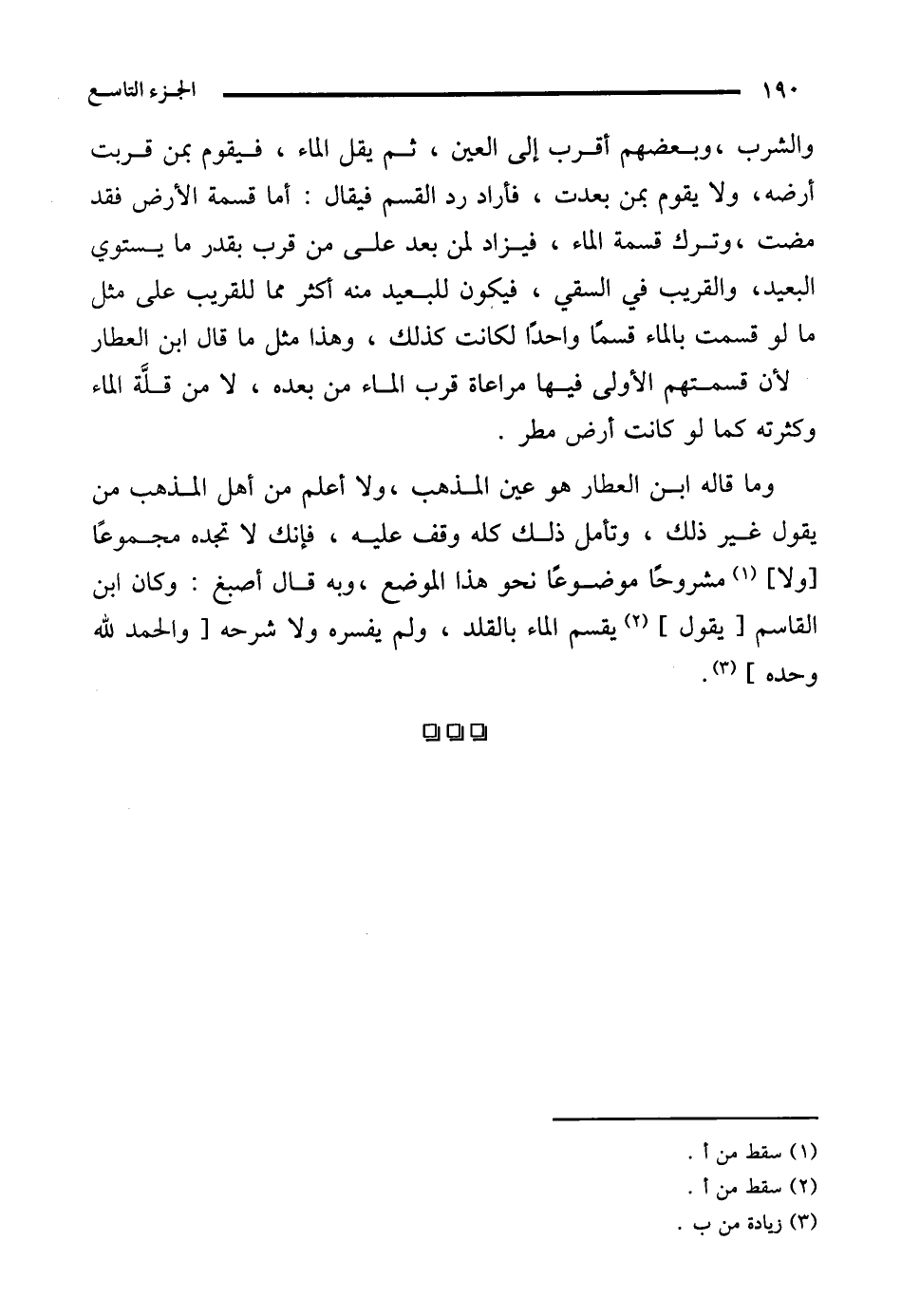 وما قاله ابن العطار هو عين المذهب، ولا أعلم من أهل المذهب من يقول غير ذلك، وتأمل ذلك كله وقف عليه، فإنك لا تجده مجموعًا [ولا] (¬1) مشروحًا موضوعًا نحو هذا الموضع، وبه قال أصبغ: وكان ابن القاسم [يقول] (¬2) يقسم الماء بالقلد، ولم يفسره ولا شرحه [والحمد لله وحده] (¬3).