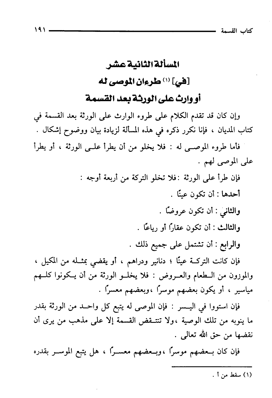 وإن كان قد تقدم الكلام على طروء الوارث على الورثة بعد القسمة في كتاب المديان، فإنا نكرر ذكره في هذه المسألة لزيادة بيان ووضوح إشكال.