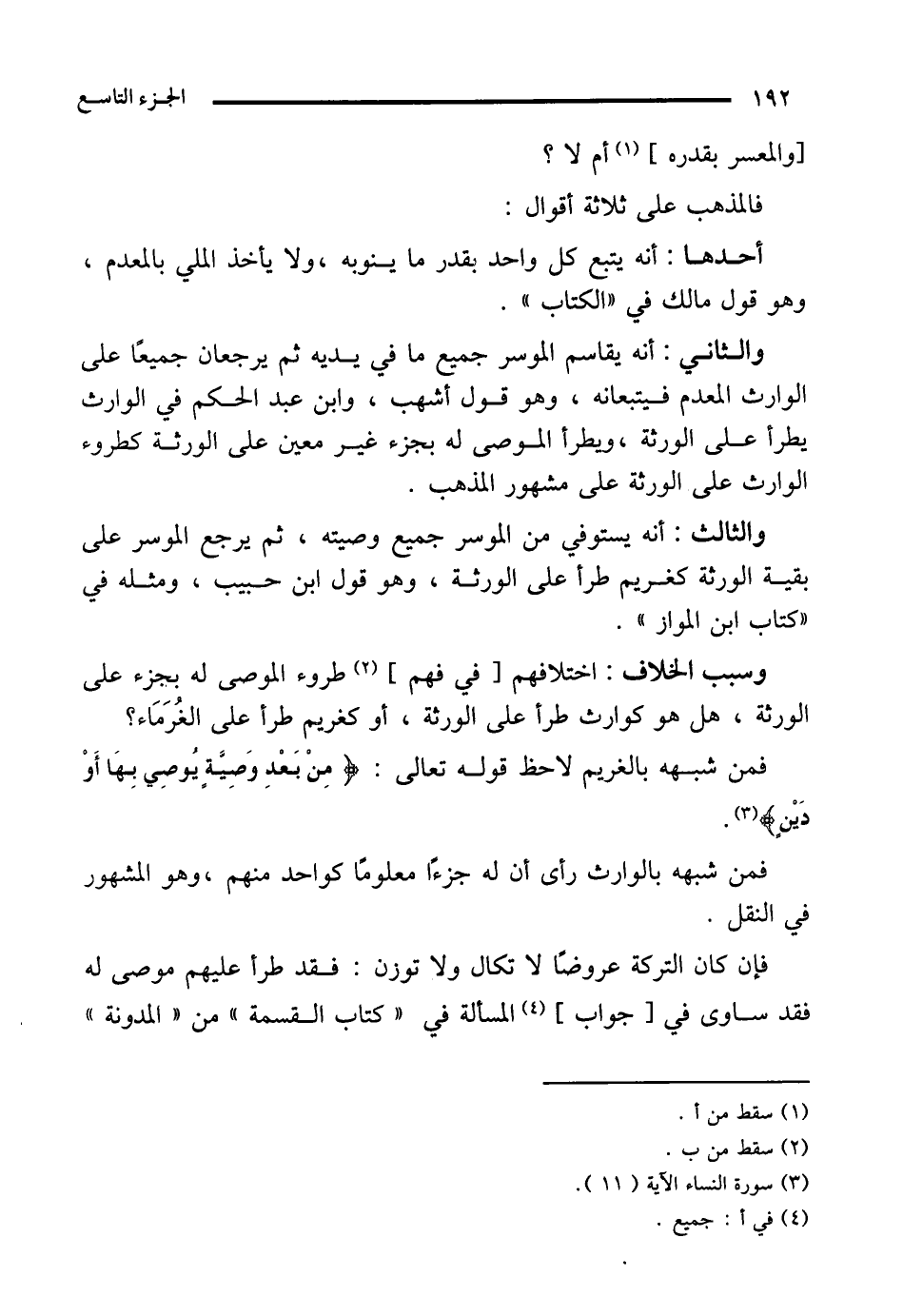 والثاني: أنه يقاسم الموسر جميع ما في يديه ثم يرجعان جميعًا على الوارث المعدم فيتبعانه، وهو قول أشهب، وابن عبد الحكم في الوارث يطرأ على الورثة، ويطرأ الموصى له بجزء غير معين على الورثة كطروء الوارث على الورثة على مشهور المذهب.