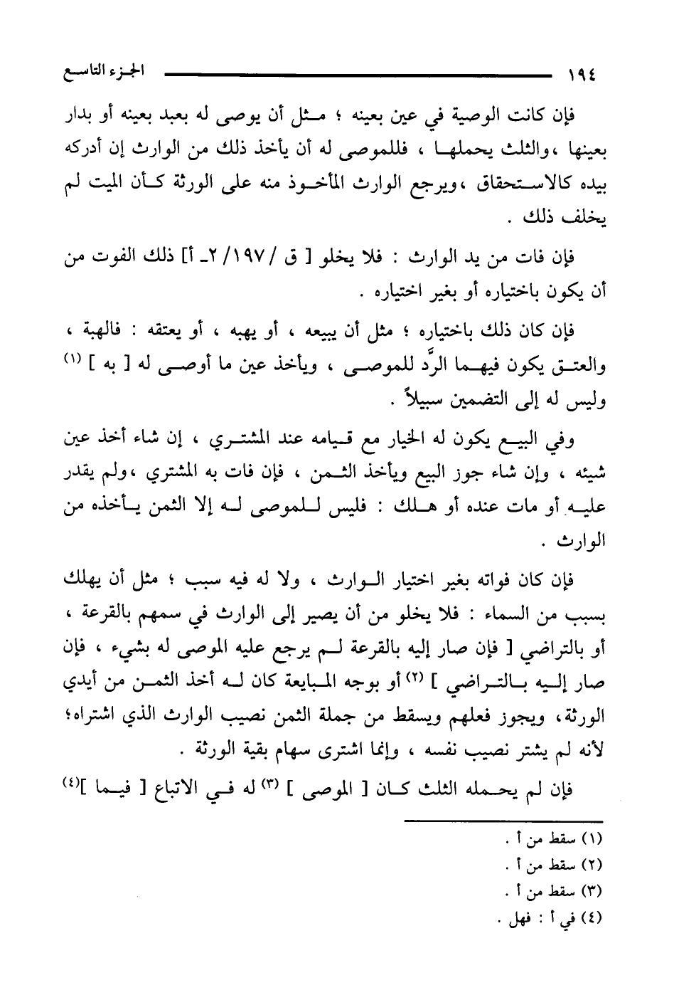 فإن كان فواته بغير اختيار الوارث، ولا له فيه سبب؛ مثل أن يهلك بسبب من السماء: فلا يخلو من أن يصير إلى الوارث في سمهم بالقرعة، أو بالتراضي [فإن صار إليه بالقرعة لم يرجع عليه الموصى له بشيء، فإن صار إليه بالتراضي] (¬2) أو بوجه المبايعة كان له أخذ الثمن من أيدي الورثة، ويجوز فعلهم ويسقط من جملة الثمن نصيب الوارث الذي اشتراه؛ لأنه لم يشتر نصيب نفسه، وإنما اشترى سهام بقية الورثة.