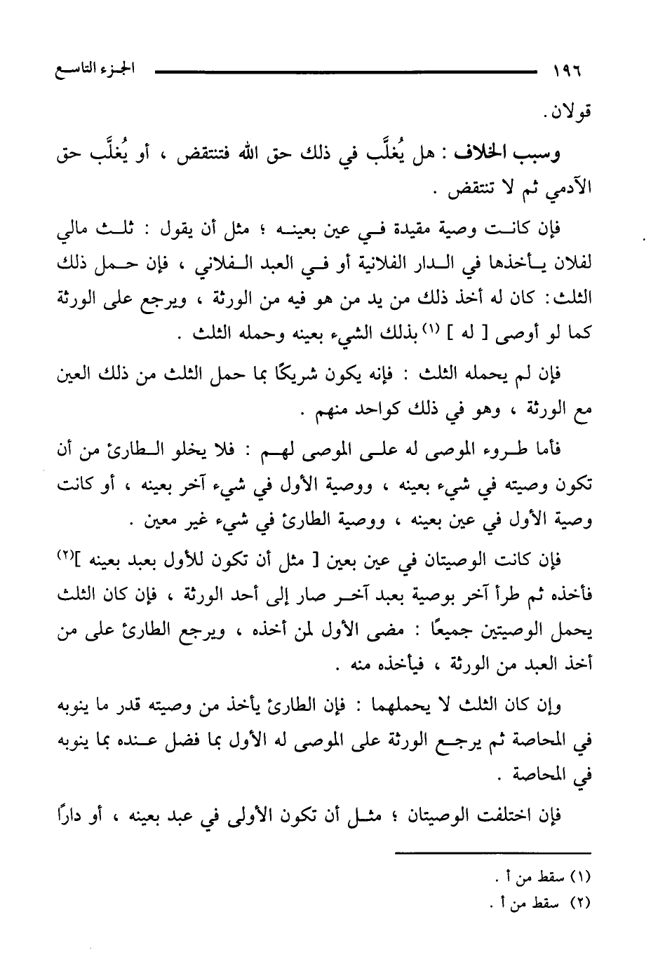 فأما طروء الموصى له على الموصى لهم: فلا يخلو الطارئ من أن تكون وصيته في شيء بعينه، ووصية الأول في شيء آخر بعينه، أو كانت وصية الأول في عين بعينه، ووصية الطارئ في شيء غير معين.