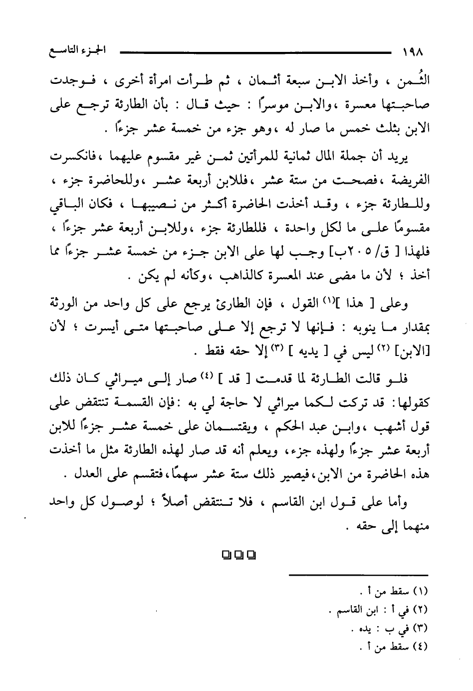 فلو قالت الطارئة لما قدمت [قد] (¬4) صار إلى ميراثي كان ذلك كقولها: قد تركت لكما ميراثي لا حاجة لي به: فإن القسمة تنتقض على قول أشهب، وابن عبد الحكم، ويقتسمان على خمسة عشر جزءًا للابن أربعة عشر جزءًا ولهذه جزء، ويعلم أنه قد صار لهذه الطارئة مثل ما أخذت هذه الحاضرة من الابن، فيصير ذلك ستة عشر سهمًا، فتقسم على العدل.