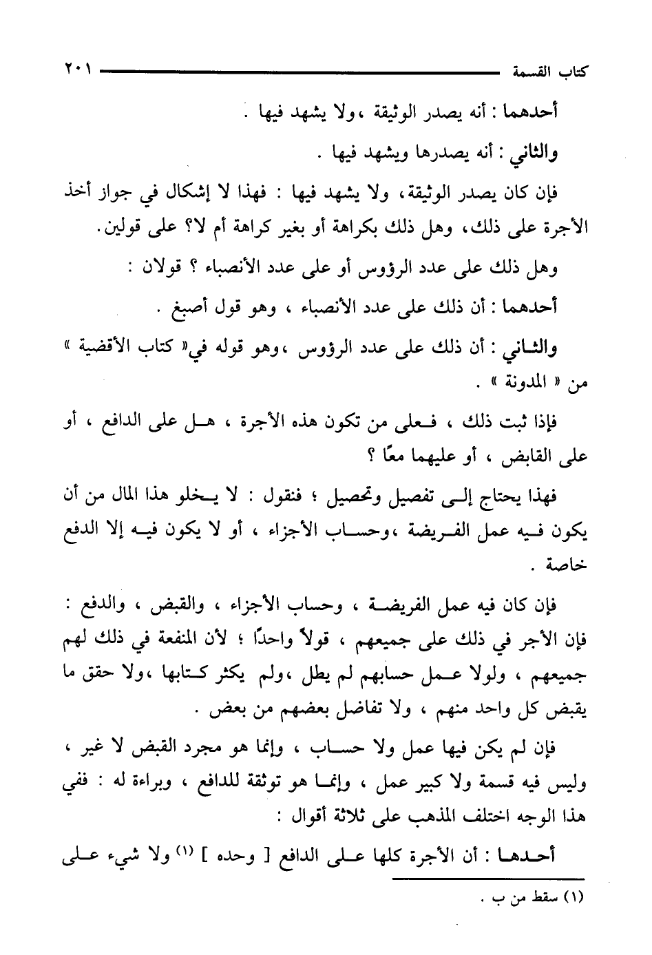 فإن لم يكن فيها عمل ولا حساب، وإنما هو مجرد القبض لا غير، وليس فيه قسمة ولا كبير عمل، وإنما هو توثقة للدافع، وبراءة له: ففي هذا الوجه اختلف المذهب على ثلاثة أقوال: