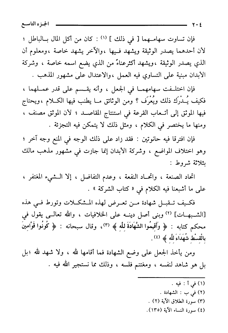 فإن تساوت سهامهما [في ذلك] (¬1)؛ كان من أكل المال بالباطل؛ لأن أحدهما يصدر الوثيقة ويشهد فيها، والآخر يشهد خاصة، ومعلوم أن الذي يصدر الوثيقة، ويشهد أكثر عناءً من الذي يضع اسمه خاصة، وشركة الأبدان مبنية على التساوي فيه العمل، والاعتدال على مشهور المذهب.