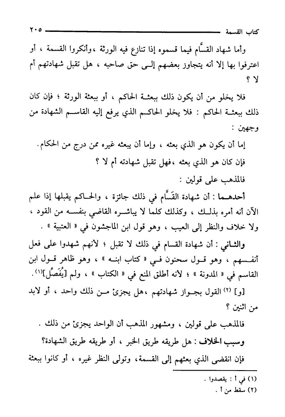والثاني: أن شهادة القسام في ذلك لا تقبل؛ لأنهم شهدوا على فعل أنفسهم، وهو قول سحنون في "كتاب ابنه"، وهو ظاهر قول ابن القاسم في "المدونة"؛ لأنه أطلق المنع في "الكتاب"، ولم [يُفَصِّل] (¬1).
