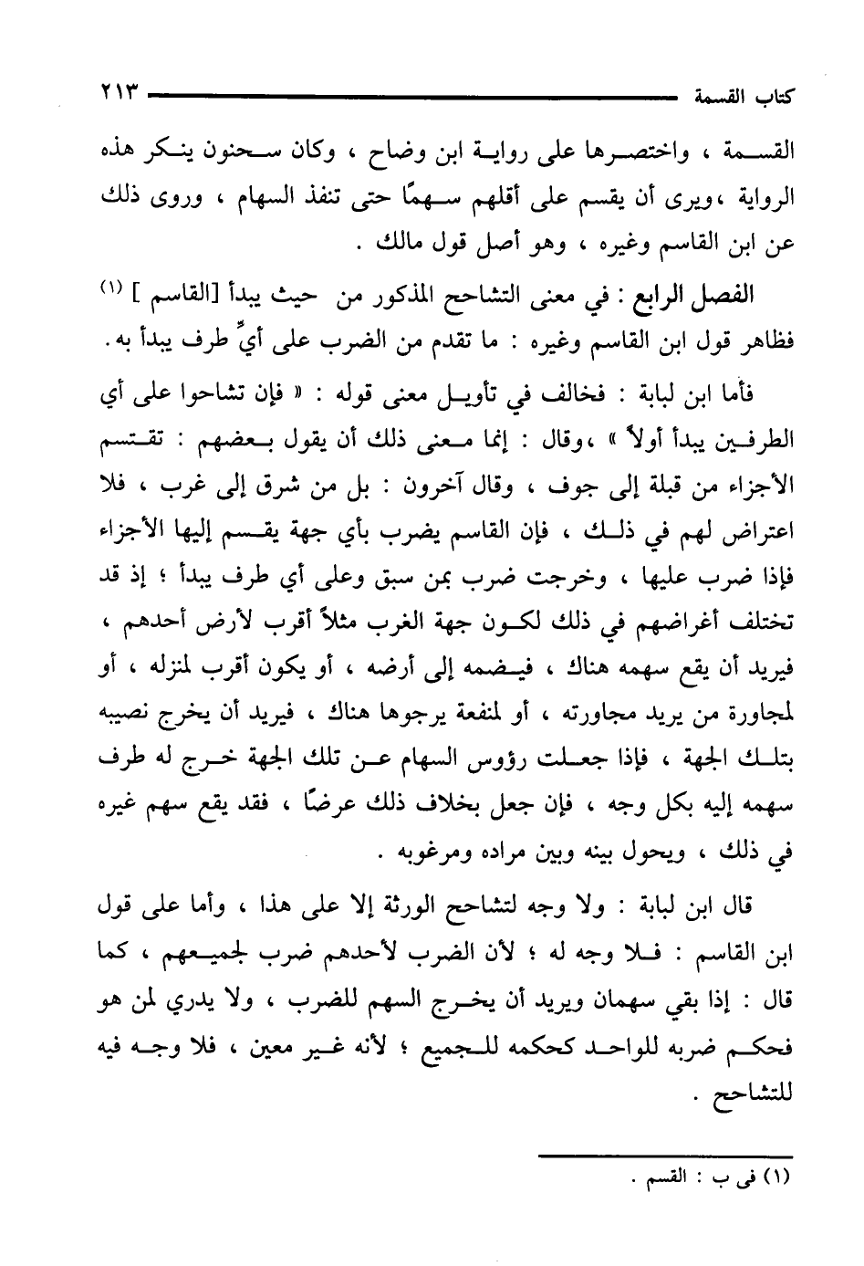 القسمة، واختصرها على رواية ابن وضاح، وكان سحنون ينكر هذه الرواية , ويرى أن يقسم على أقلهم سهمًا حتى تنفذ السهام، وروى ذلك عن ابن القاسم وغيره، وهو أصل قول مالك.