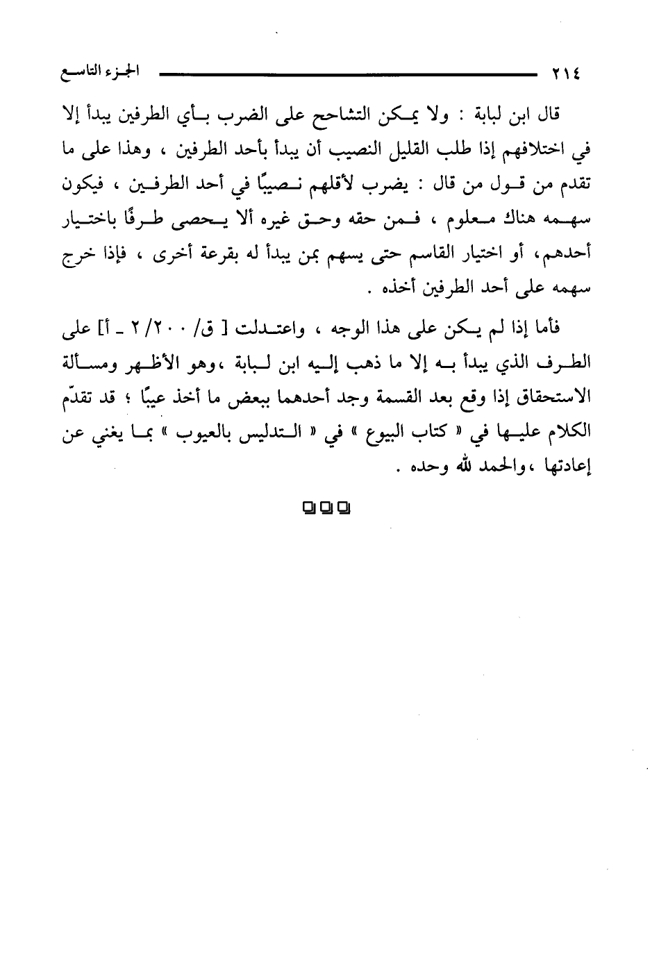 قال ابن لبابة: ولا يمكن التشاحح على الضرب بأي الطرفين يبدأ إلا في اختلافهم إذا طلب القليل النصيب أن يبدأ بأحد الطرفين، وهذا على ما تقدم من قول من قال: يضرب لأقلهم نصيبًا في أحد الطرفين، فيكون سهمه هناك معلوم، فمن حقه وحق غيره ألا يحصى طرفًا باختيار أحدهم، أو اختيار القاسم حتى يسهم بمن يبدأ له بقرعة أخرى، فإذا خرج سهمه على أحد الطرفين أخذه.