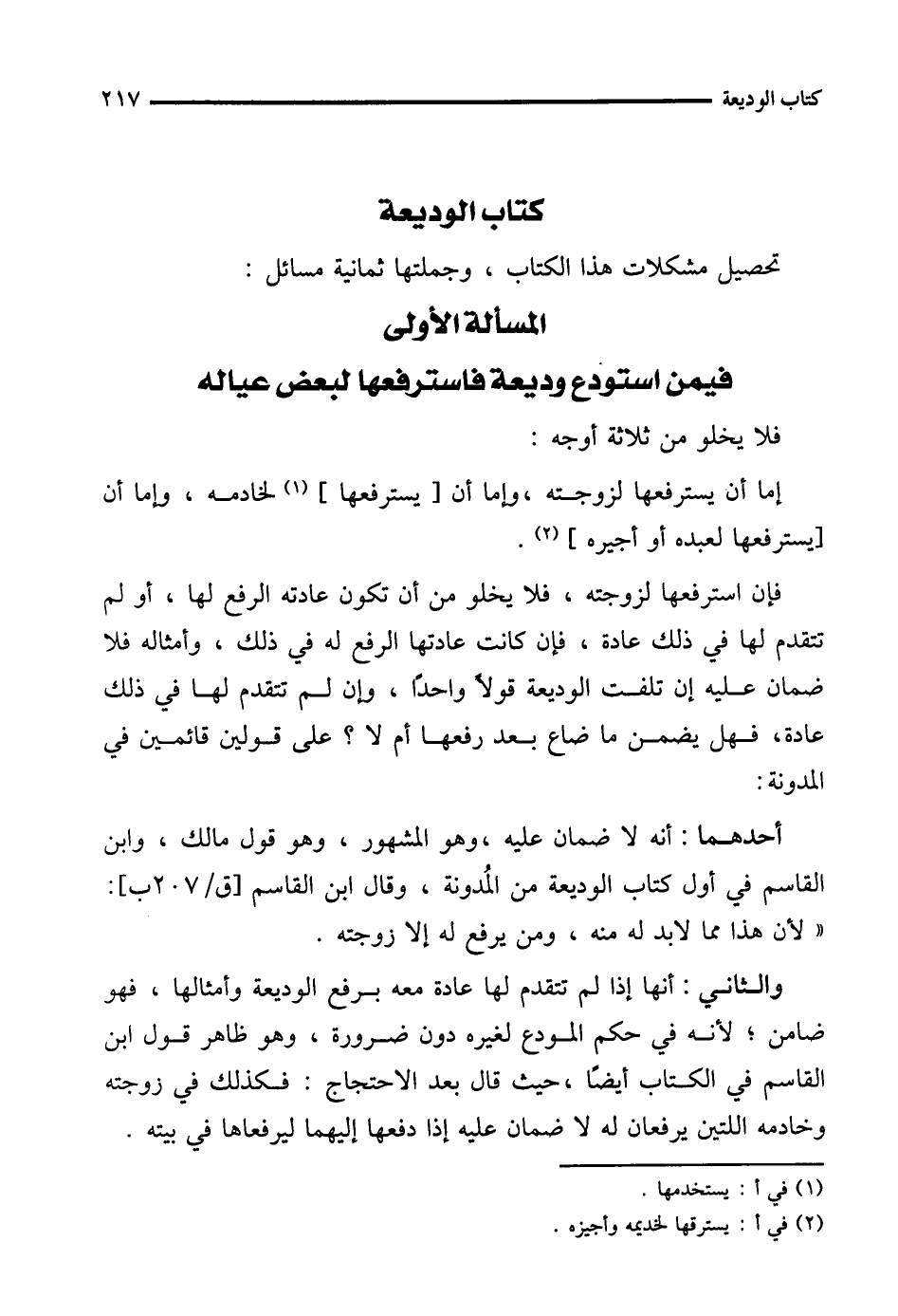 المسألة الأولى فيمن استودع وديعة فاسترفعها لبعض عياله
