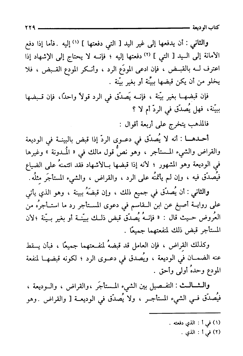 أحدها: أنه لا يُصدّق في دعوى الردّ إذا قبض بالبينة في الوديعة والقراض والشيء المستأجر، وهو نصُّ قول مالك في "المُدونة" وغيرها في الوديعة وهو المشهور؛ لأنه إذا قبضها بالأشهاد فقد ائتمنهُ على الضياع فيُصدّق فيه، وإن لم يأتمنُه على الرد، والقراض، والشيء المستأجَر مِثلُه.