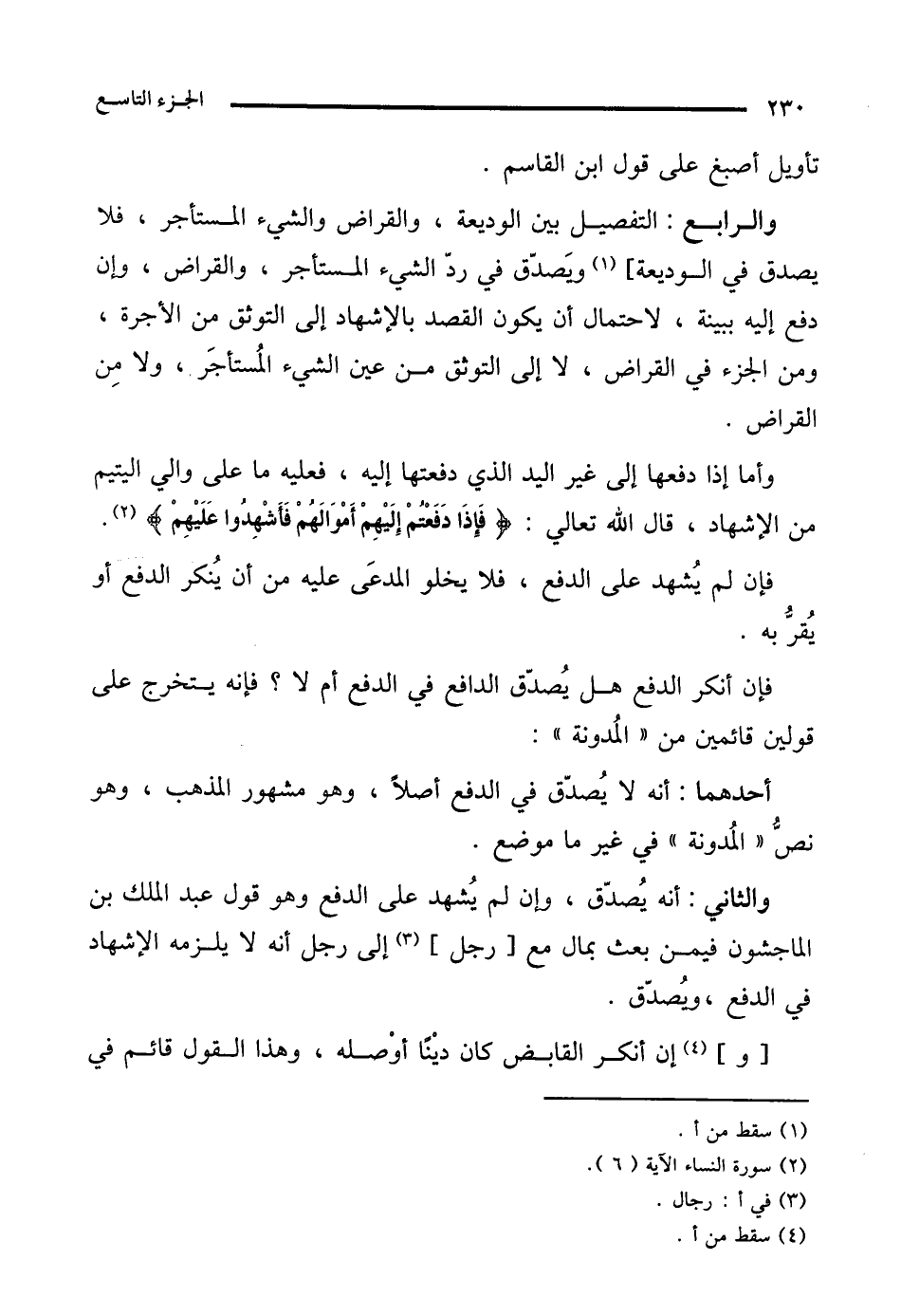 وأما إذا دفعها إلى غير اليد الذي دفعتها إليه، فعليه ما على والي اليتيم من الإشهاد، قال الله تعالي: {فَإِذَا دَفَعْتُمْ إِلَيْهِمْ أَمْوَالَهُمْ فَأَشْهِدُوا عَلَيْهِمْ} (¬2).