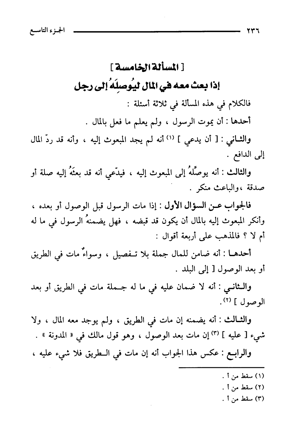 فالجواب عن السؤال الأول: إذا مات الرسول قبل الوصول أو بعده، وأنكر المبعوث إليه بالمال أن يكون قد قبضه، فهل يضمنهُ الرسول في ماله أم لا؟ فالمذهب على أربعة أقوال: