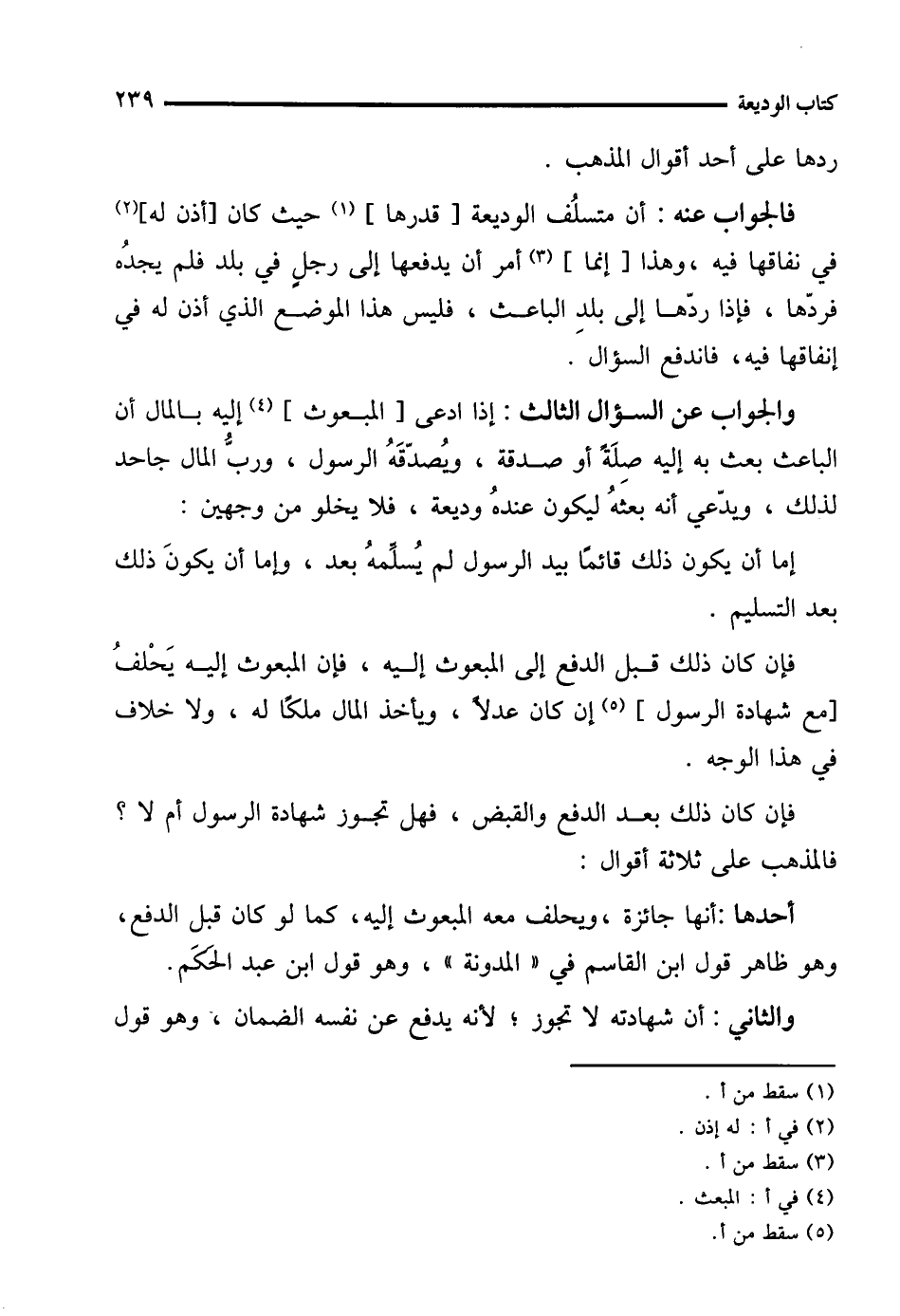 والجواب عن السؤال الثالث: إذا ادعى [المبعوث] (¬4) إليه بالمال أن الباعث بعث به إليه صِلَةً أو صدقة، ويُصدّقَهُ الرسول، وربُّ المال جاحد لذلك، ويدّعي أنه بعثهُ ليكون عندهُ وديعة، فلا يخلو من وجهين: