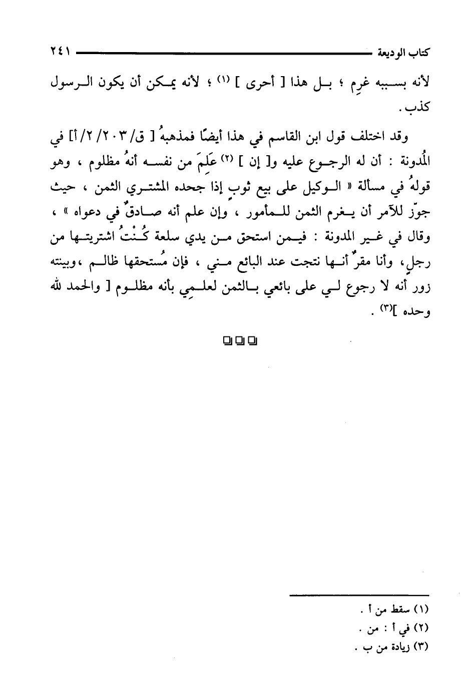 وقد اختلف قول ابن القاسم في هذا أيضًا فمذهبهُ في المُدونة: أن له الرجوع عليه و [إن] (¬2) عَلِمَ من نفسه أنهُ مظلوم، وهو قولهُ في مسألة "الوكيل على بيع ثوبٍ إذا جحده المشتري الثمن، حيث جوّز للآمر أن يغرم الثمن للمأمور، وإن علم أنه صادقٌ في دعواه"، وقال في غير المدونة: فيمن استحق من يدي سلعة كُنْتُ اشتريتها من رجلٍ، وأنا مقرٌ أنها نتجت عند البائع مني، فإن مُستحقها ظالم، وبينته زور أنه لا رجوع لي على بائعي بالثمن لعلمِي بأنه مظلوم [والحمد لله وحده] (¬3).