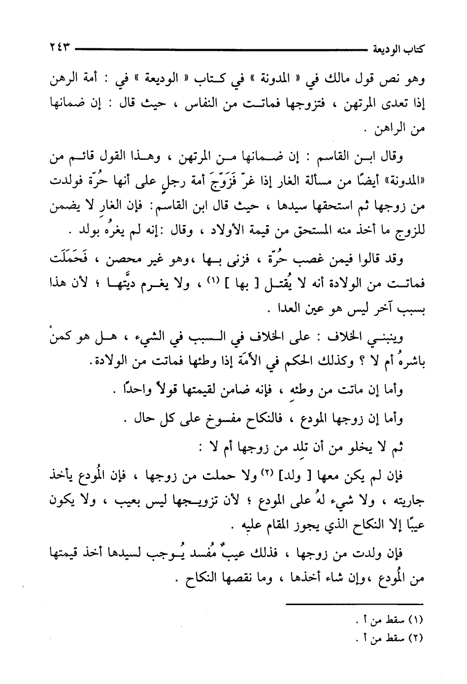 وهو نص قول مالك في "المدونة" في كتاب "الوديعة" في: أمة الرهن إذا تعدى المرتهن، فتزوجها فماتت من النفاس، حيث قال: إن ضمانها من الراهن.