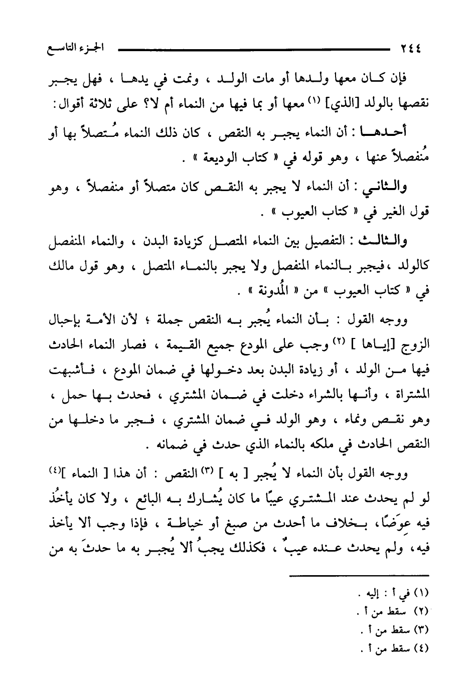 ووجه القول بأن النماء لا يُجبر [به] (¬3) النقص: أن هذا [النماء] (¬4) لو لم يحدث عند المشتري عيبًا ما كان يُشارك به البائع، ولا كان يأخُذ فيه عِوَضًا، بخلاف ما أحدث من صبغ أو خياطة، فإذا وجب ألا يأخذ فيه، ولم يحدث عنده عيبٌ، فكذلك يجبُ ألا يُجبر به ما حدثَ به من