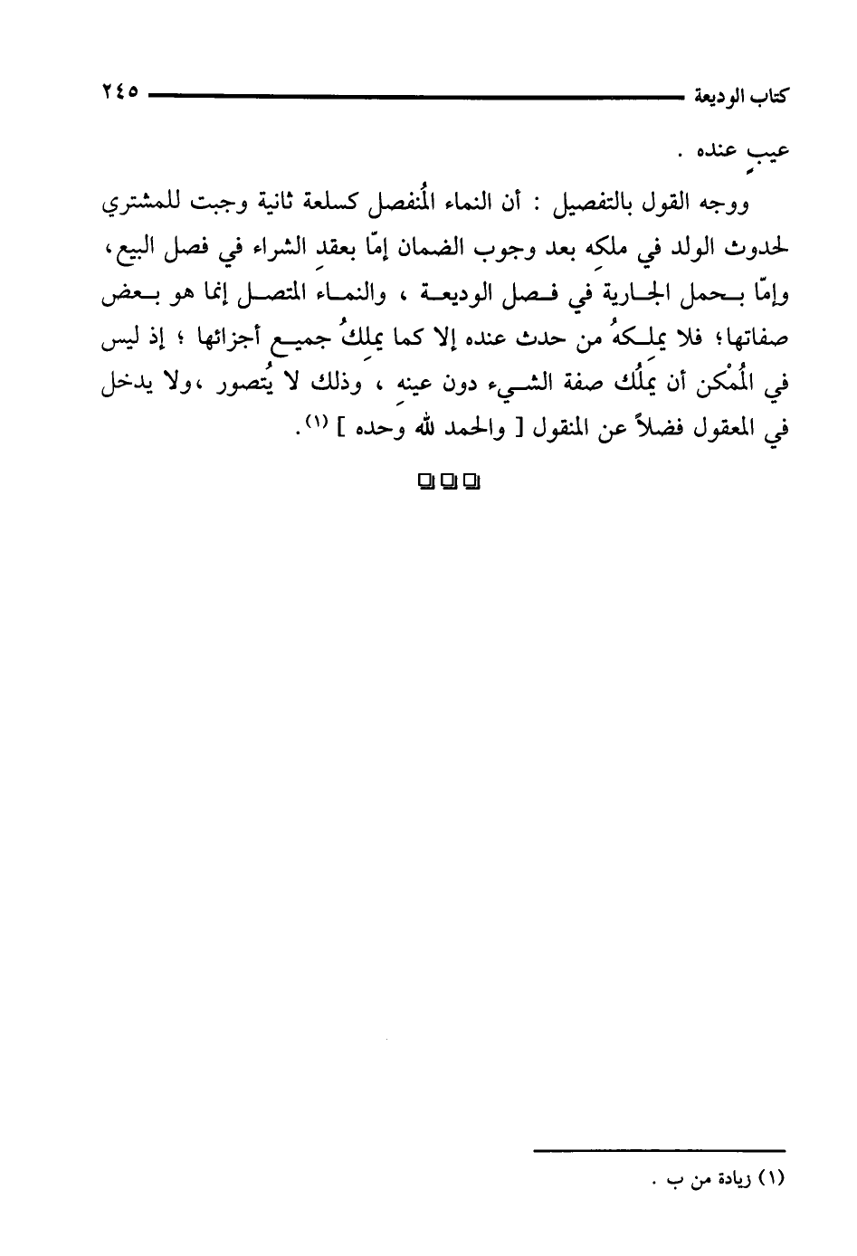 ووجه القول بالتفصيل: أن النماء المُنفصل كسلعة ثانية وجبت للمشتري لحدوث الولد في ملكِه بعد وجوب الضمان إما بعقد الشراء في فصل البيع، وإمّا بحمل الجارية في فصل الوديعة، والنماء المتصل إنما هو بعض صفاتها؛ فلا يملكهُ من حدث عنده إلا كما يملكُ جميع أجزائها؛ إذ ليس في المُمْكن أن يملُك صفة الشيء دون عينهِ، وذلك لا يُتصور، ولا يدخل في المعقول فضلًا عن المنقول [والحمد لله وحده] (¬1).