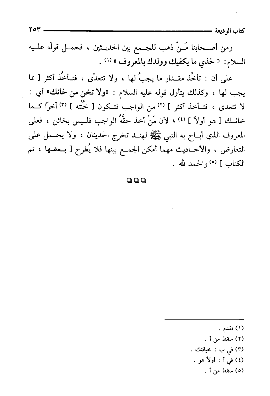 على أن: تأخُذ مقدار ما يجبُ لها, ولا تتعدّى، فتأخُذ أكثر [مما يجب لها، وكذلك يتأول قوله عليه السلام: "ولا تخن من خانك" أي: لا تتعدى، فتأخذ أكثر] (¬2) من الواجب فتكون [خُنْته] (¬3) آخرًا كما خانك [هو أولًا] (¬4)؛ لأن مَنْ أخذ حقَّهُ الواجب فليس بخائن، فعلى المعروف الذي أباح به النبي - صلى الله عليه وسلم - لهند تخرج الحديثان، ولا يحمل على التعارض، والأحاديث مهما أمكن الجمع بينها فلا يُطرح [بعضها، تم الكتاب] (¬5) والحمد لله.