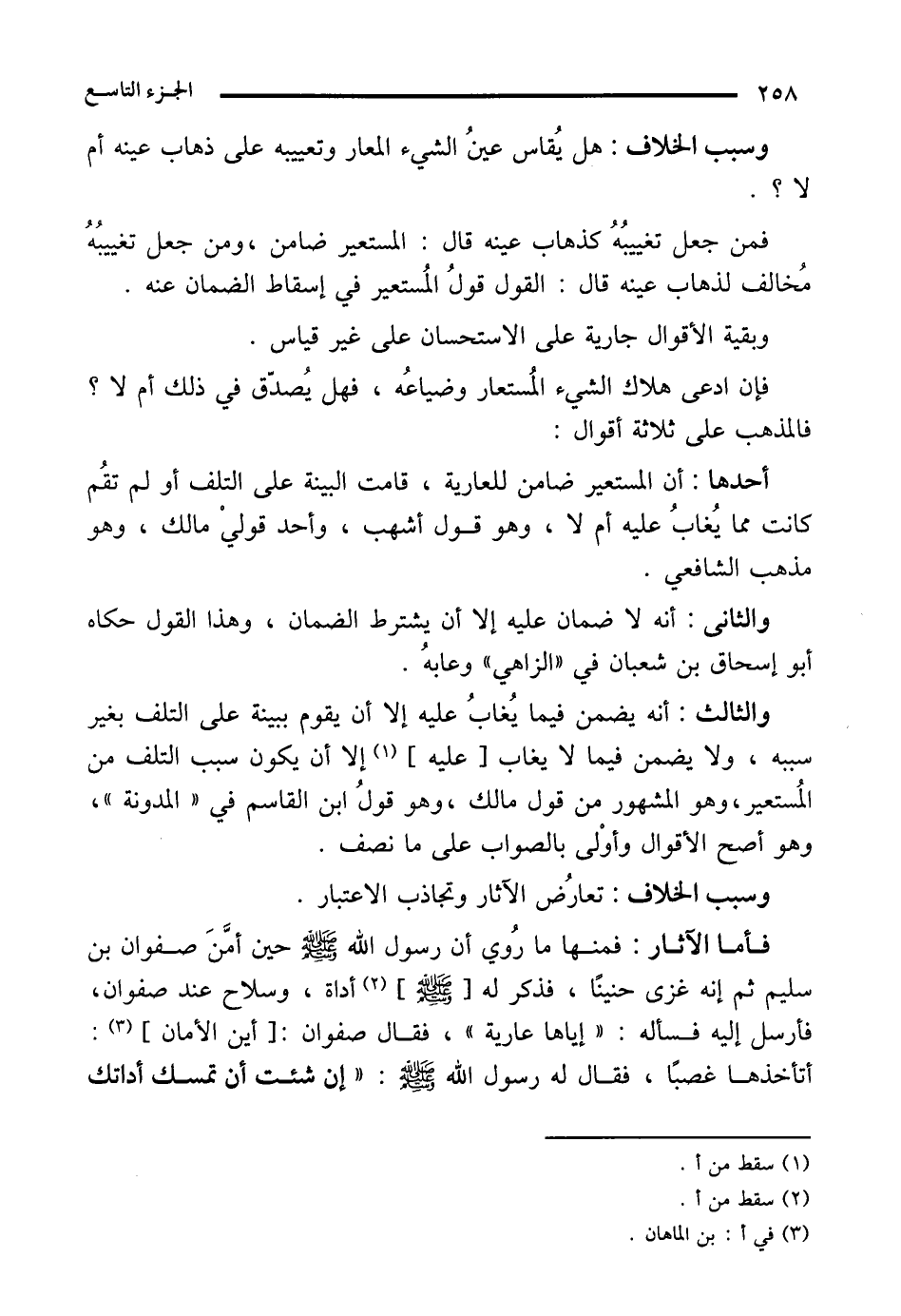 وسبب الخلاف: هل يُقاس عينُ الشيء المعار وتغييبه على ذهاب عينه أم لا؟.